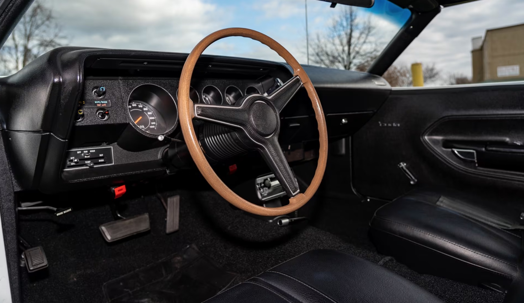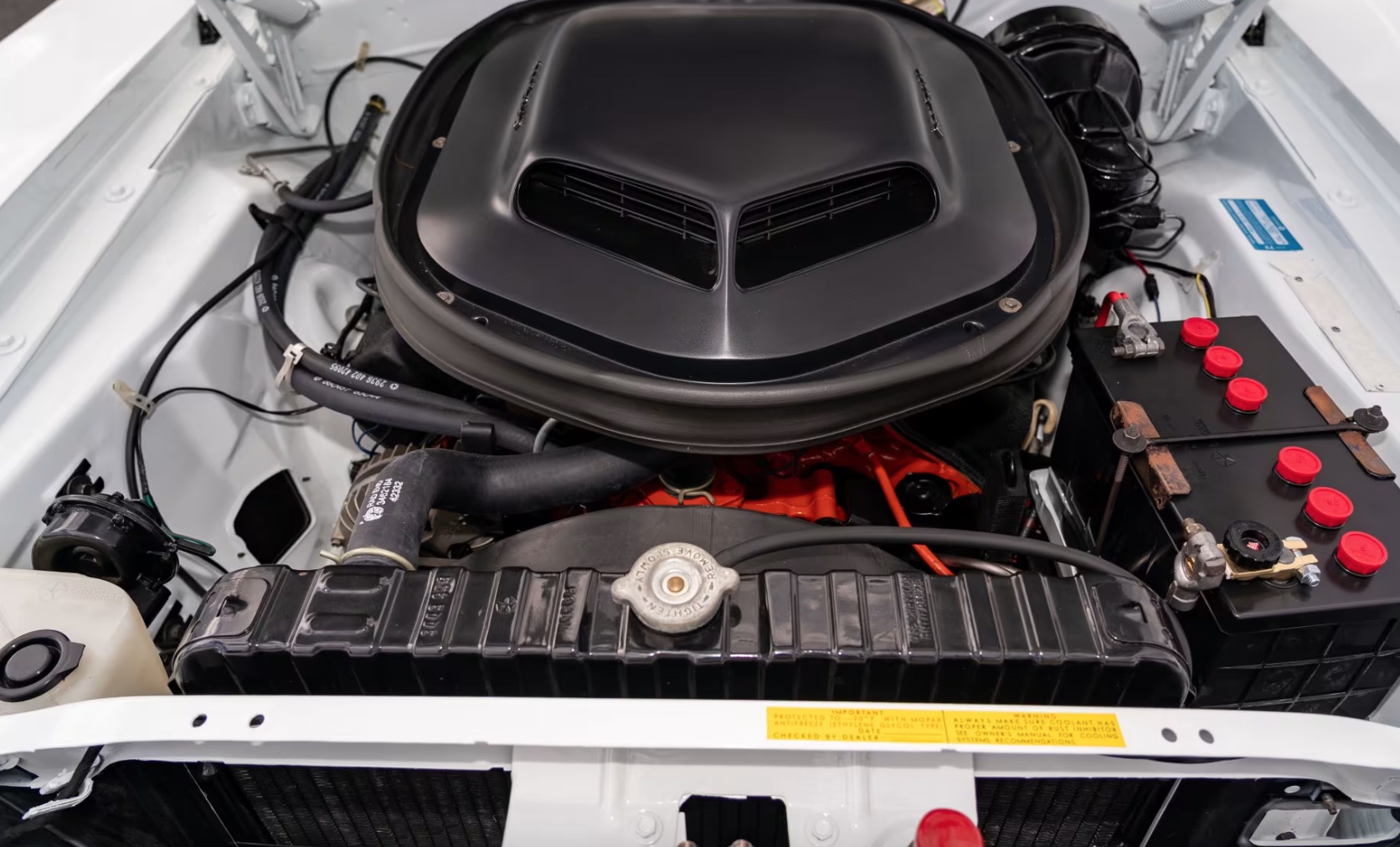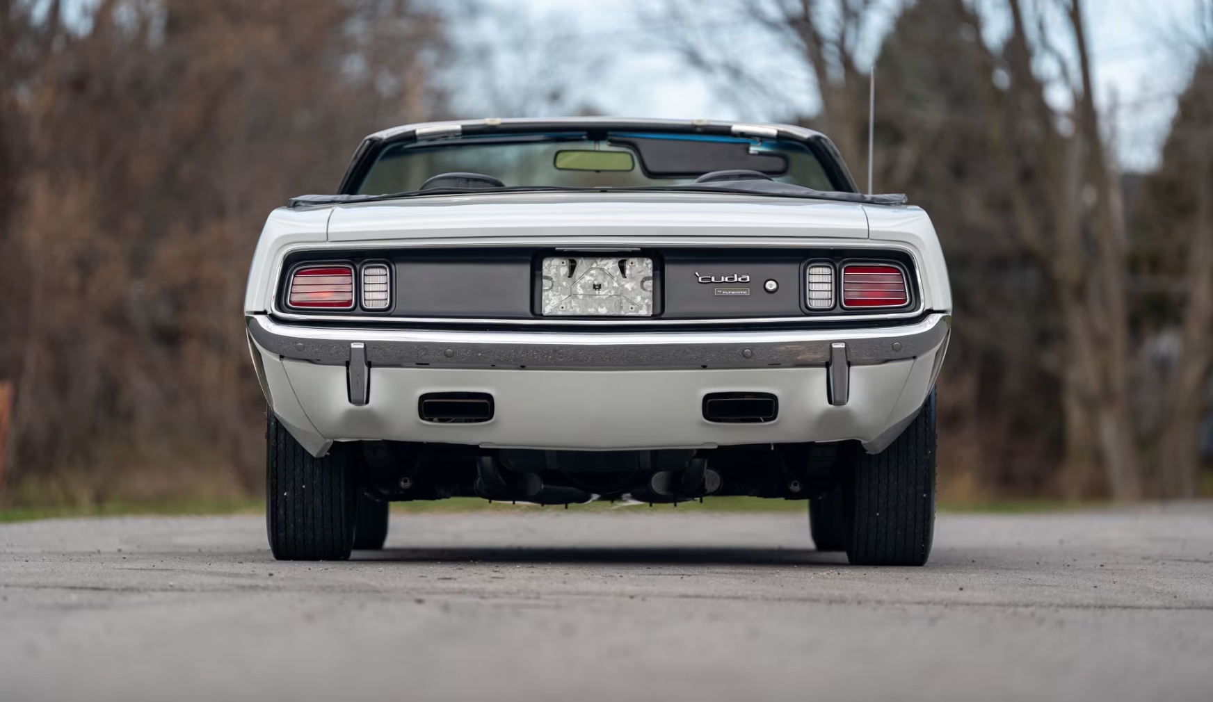 There’s already a lot going on with this unique HEMI ’Cuda Convertible, but this one has been documented as the first one built for the 1971 model year. With a born-on date of September 9, 1970, at Chrysler’s Hamtramck Assembly Plant, the car was nicknamed ‘The White Elephant’ due to its color, and of course, the HEMI’s moniker as a pachyderm. While the 426 HEMI was developed for racing, the Street HEMI was its tamed down relative to provide reliable motoring for those brave and wealthy enough to order one of these. This HEMI ’Cuda Convertible has more creature comforts, such as an A727 TorqueFlite automatic transmission, A36 Performance Axle Package, which includes the Sure Grip 8.75-inch differential with 3.55 gear ratio, AM Radio, tape cassette player w/microphone, power brakes, power steering, power top and other items to make this powerful Plymouth more civilized for daily commutes. What’s odd, whoever ordered this car new didn’t opt for the Rallye dash, center-mounted floor console or Rallye wheels. But with the HEMI option, all 1970 and 1971 ’Cudas received the Shaker hood as part of the package, and yes, it quivers under those twin Carter AFB carburetors that gulp air and fuel to feed the potent HEMI engine. Visually, it’s part of the car’s appeal and makes this ’Cuda even more desirable.