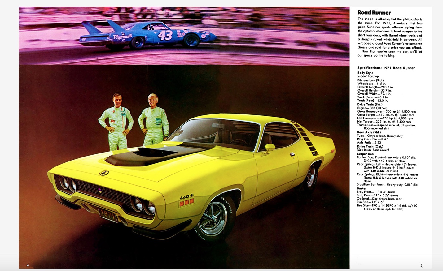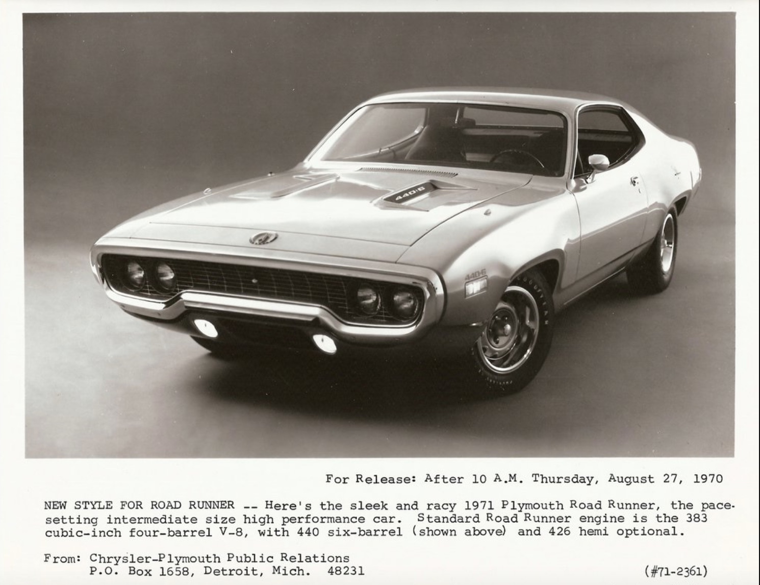For 1971, the 440 carried on with very few changes from 1970, other than a slight drop in horsepower. Both the Challenger R/T and ’Cuda dropped the 440 Magnum/Super Commando single four-barrel option, but the Six Pack/six-barrel was still offered. On full-sized Plymouth people movers, the massive Sport Fury GT with its standard 440 Super Commando still hung around, but sales had dropped dramatically from 1970. The tea leaves were telling a tale of the slow erosion of the 440’s muscle prowess. It was starting to appear that both the EPA and the insurance industry were teaming up against the domestic automakers’ muscle portfolios. The writing was on the wall, and Chrysler was already making plans to prevent the total extinction of its 440-cubic-inch big block for 1972 and beyond.