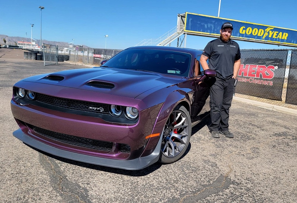 Back in 2020, Rosario bought his 2020 Dodge Challenger SRT Hellcat Redeye Widebody in Hellraisin from a dealership in Ohio, although he lived with his family in New York. He bought the car because of the classic muscular exterior design and because the “I don’t care attitude” of the Dodge Brand appealed to him. Shortly after getting the car, he saw posts online about how Dodge SRT buyers got a free one-day class at Radford Racing School. He didn’t want to make the trip across the country on his own, so he and his dad flew from New York to Arizona for the SRT Experience program. He loved the program and enjoyed his time in the area.