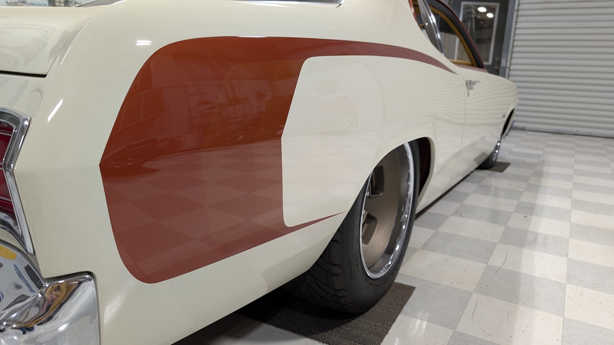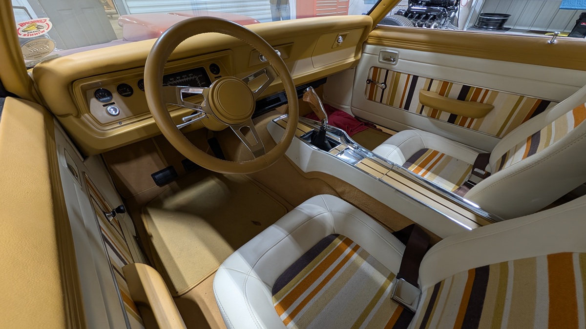“I called her and said, ‘Here’s what we’re going to do on the interior: these crazy stripes like they did back in the day,'” Jonathan recalls. “She was very hesitant about it. She thought it looked like drapes.” When the material – a 12-foot-wide roll of pure 1970s flashback – was first unrolled, even Jonathan had second thoughts. “The first thing that came to mind was, ‘What the hell am I doing?'” But he stuck with his vision. The real moment of truth came at SEMA. The owner had never seen the completed car – only renderings. As the cover was pulled off in the BASF booth, she walked straight to the window and peered inside at those controversial stripes. The entire booth fell silent. She turned around, looked at Jonathan, and delivered her verdict: “It’s not bad.”