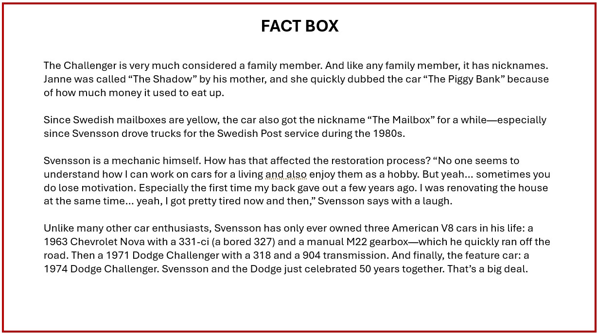 It’s rare for a car to remain in the same family for half a century. But that’s the case with Jan-Olov “Janne” Svensson and his 1974 Dodge Challenger. The Dodge even has a few nicknames of its own, like “The Mailbox” and “The Piggy Bank.” But we’ll get back to those – this Challenger has many more stories to tell.