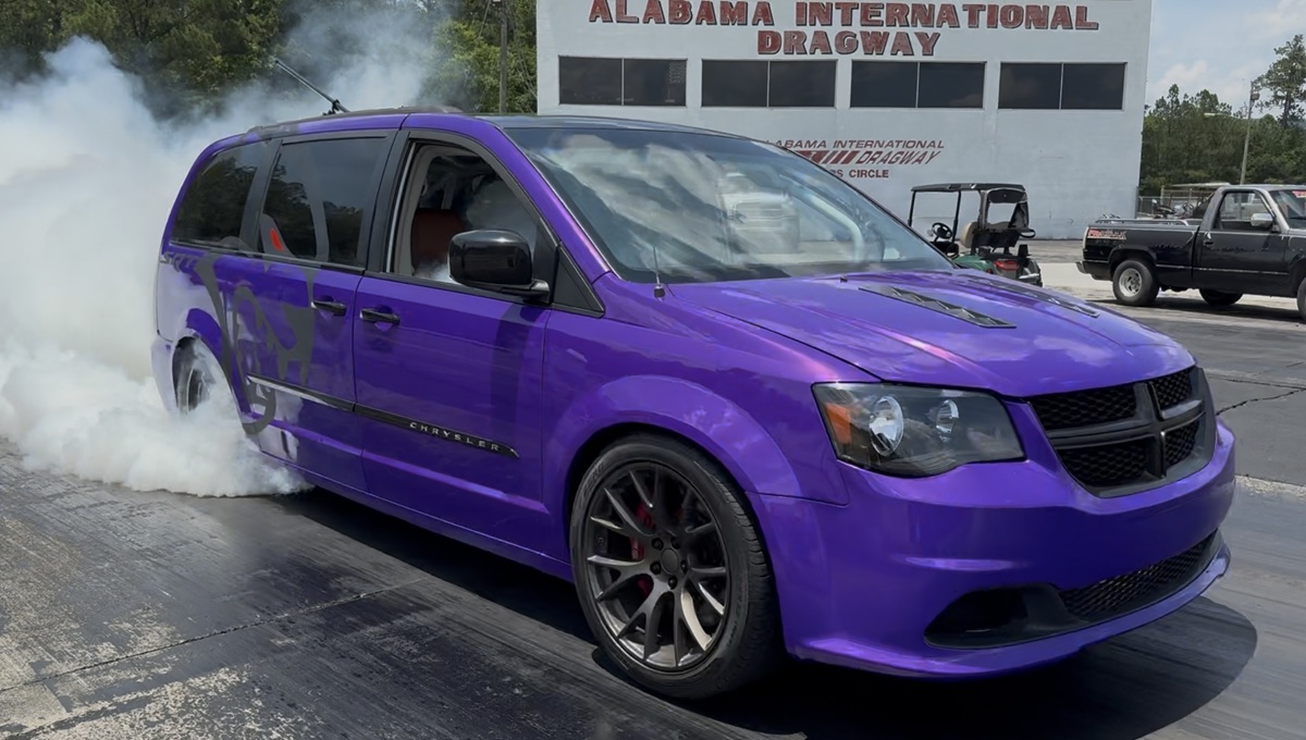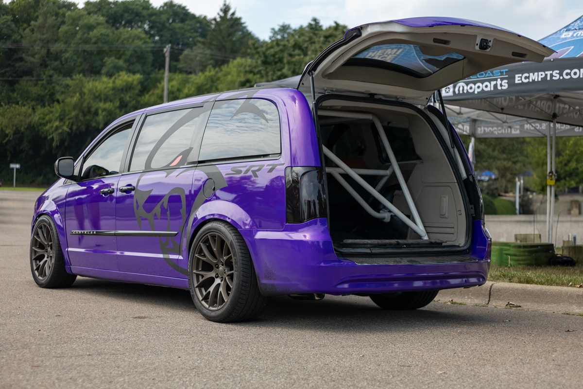 What makes this build special is its blend of absurdity and functionality. The Town & Country’s at one point hid its 1,000-hp beastlike capability of embarrassing supercars. But with its plum crazy purple wrap and huge SRT Hellcat logo, it makes it easier to find where that supercharger whine is coming from.