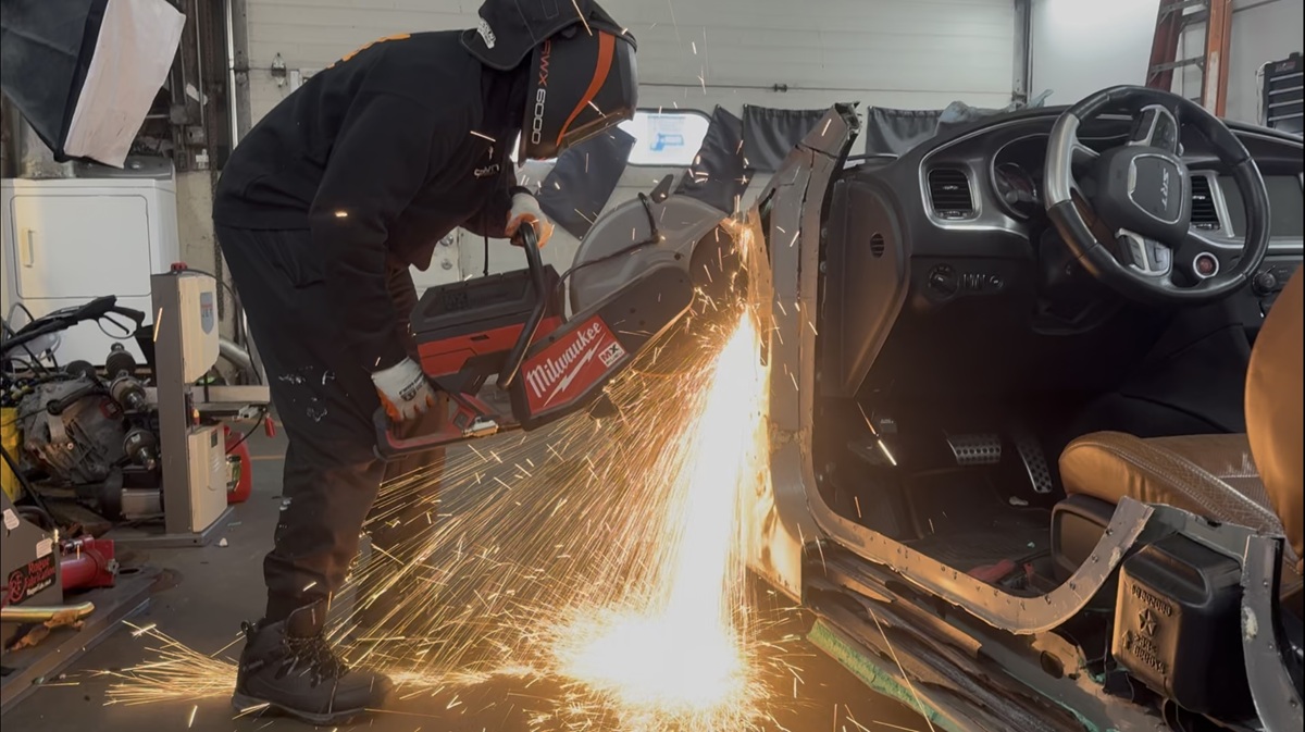 With experience building the first V8 Tesla, he knew building a chassis from scratch would take too long. He opted for a body swap. After taking measurements, they discovered the wheelbase of the Town & Country was remarkably close to the Charger’s. This made the swap feasible, though not easy. “We cut the top off the Charger and dropped the Town & Country body onto its chassis,” Rich said. Initially they had a roll cage fit for a Charger but the fans urged him to revise it for safety. The process involved extensive cutting and welding, with a 10-point roll cage that is integrated into the sway bars of the car, and the rear shocks are also adjustable.