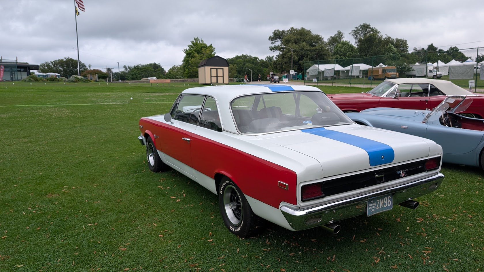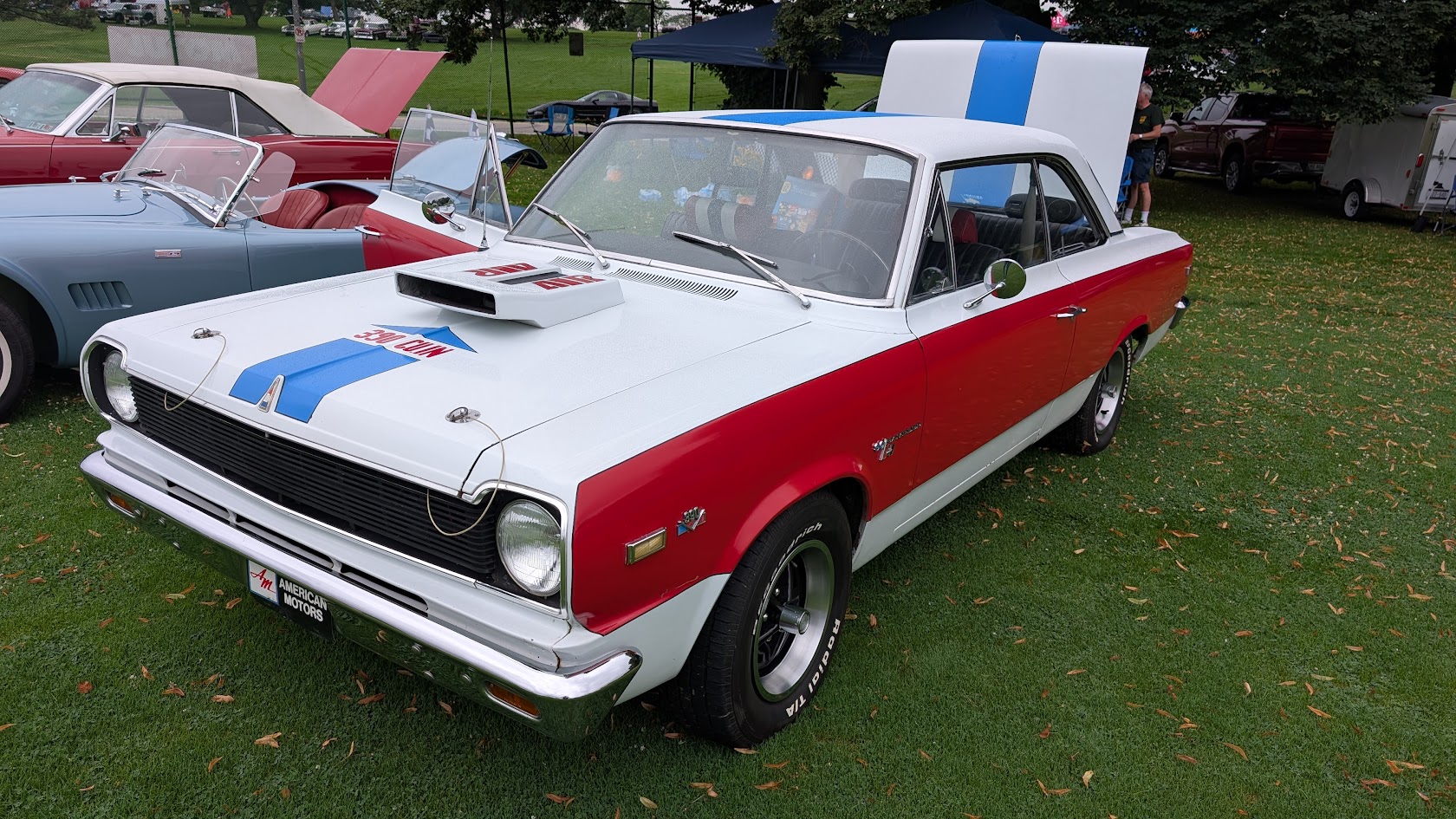 The donut sits untouched between us as rain threatens the Pittsburgh Vintage Grand Prix. Gregory Farrell politely declines – he’s watching his weight – but his enthusiasm for the red, white and blue Rambler parked nearby is anything but restrained. This is a man who has found his automotive soulmate in one of Detroit’s most unlikely muscle cars: a 1969 AMC Rebel.
