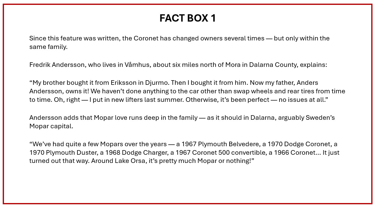 “I thought it looked good, and my friend Sven, who was over in the States, agreed. The car rolled out of the factory with a 318 cui. It was, you could say, a grandma’s car from the start. But the American owner had installed a 400, stroked to 451 cubic inches. The Coronet also had a 727 transmission, an 8¾-inch rear end, and other things that cost extra to install at home. The price was fair, so I went for it. When it arrived, it really was in good condition,” Eriksson says.