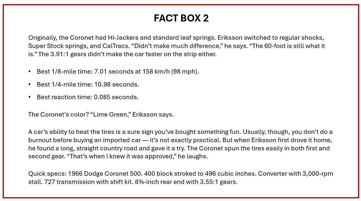 “But you always want more,” he says. “So I ported the heads and got the Coronet down to an even 12 seconds. Then the engine started drinking oil like crazy, so I decided to have a shop build a new one.”