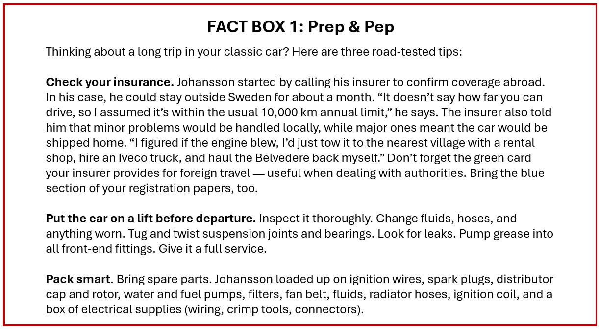 According to Johansson, the Belvedere drank about 25 percent less fuel on the continent.