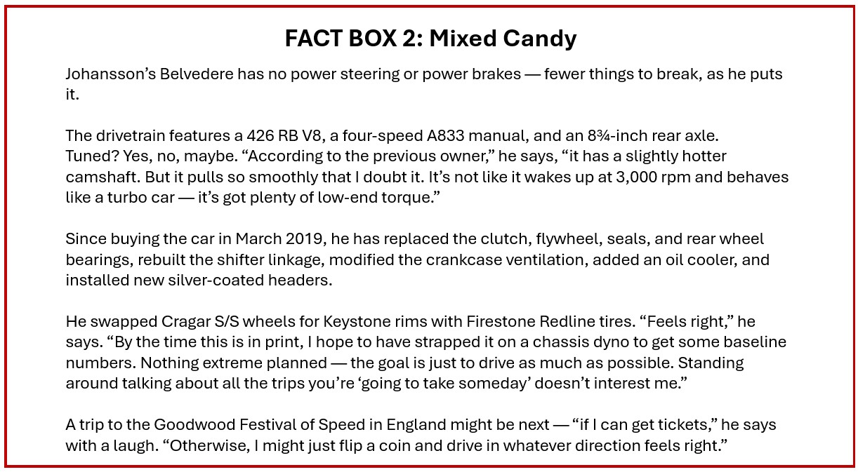 “I looked at Chevelles and Torinos for a while, but then I found this Belvedere. I didn’t even need to drive it – just sitting in it once was enough. It felt perfect.”