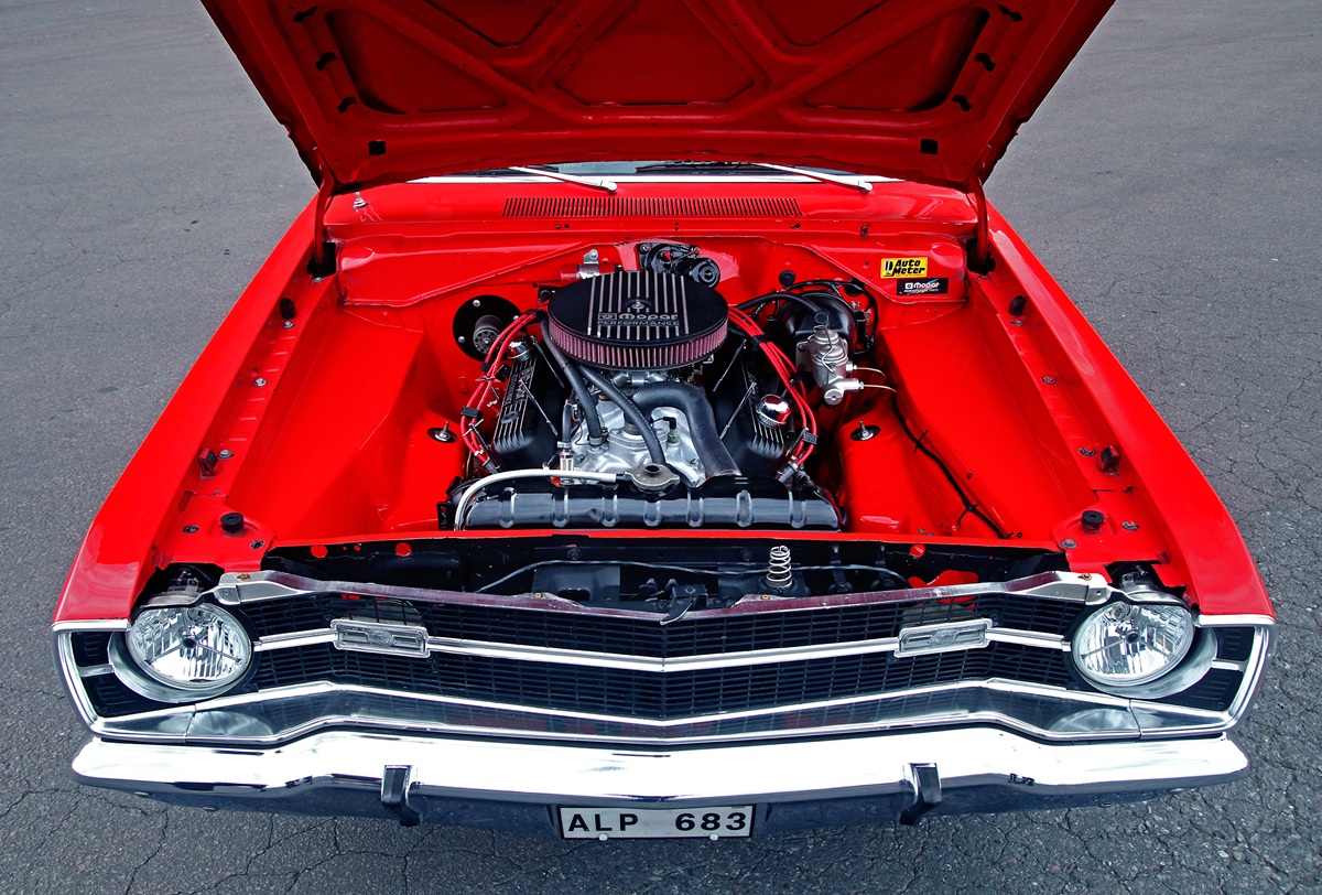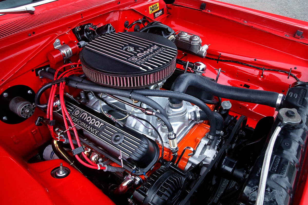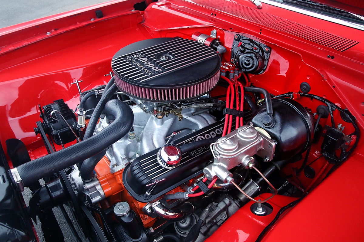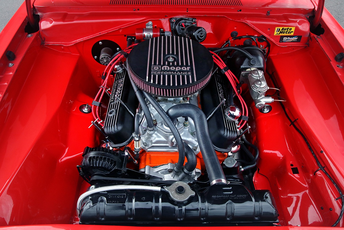 The drivetrain consists of a 340 small-block, a 727 TorqueFlite and Mopar’s 8¾-inch rear axle. The V8 wears an Edelbrock Victor intake and a Holley 650 cfm carburetor.