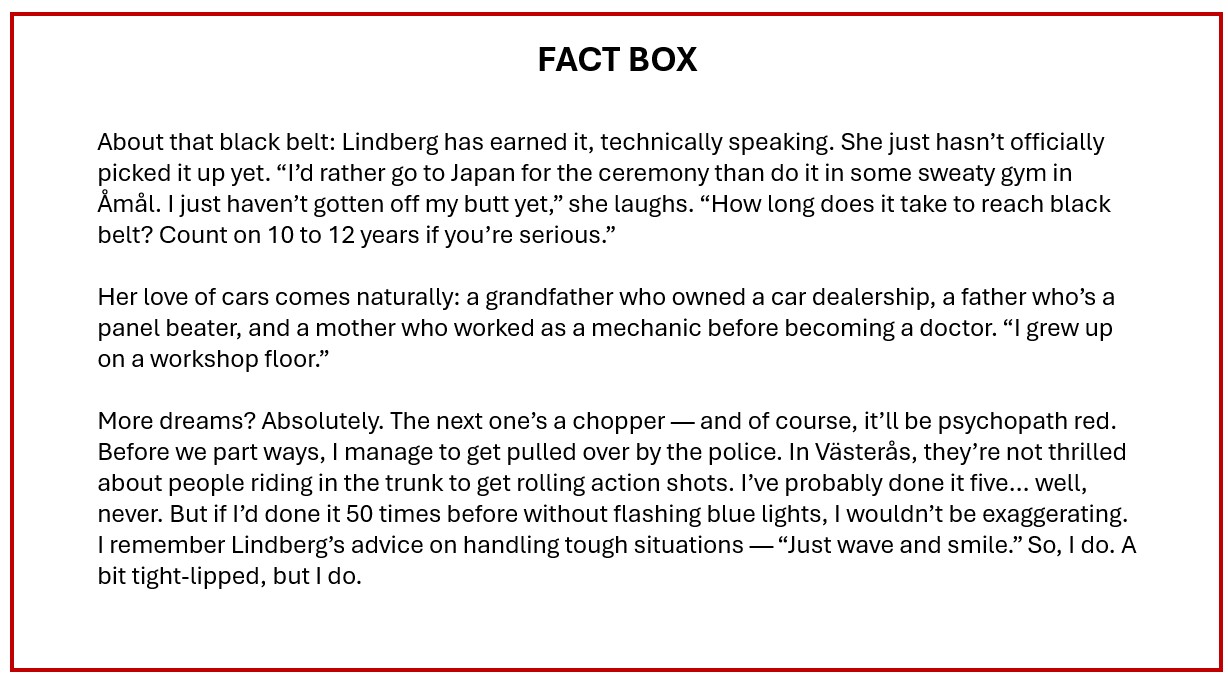 The pillows weren’t needed – nor was any hesitation about buying the car. The Dart appeared on Blocket (Sweden’s Craigslist) at 7 p.m. Ten minutes later, Lindberg was in the car heading toward Skara. By 11 p.m., she arrived – and minutes later, the deal was done. When it comes to “from thought to action,” she’s almost as fast as the peregrine falcons nesting above us. Those birds, the fastest in the world, can hit 320 km/h – and Lindberg Ozolinš isn’t far behind.