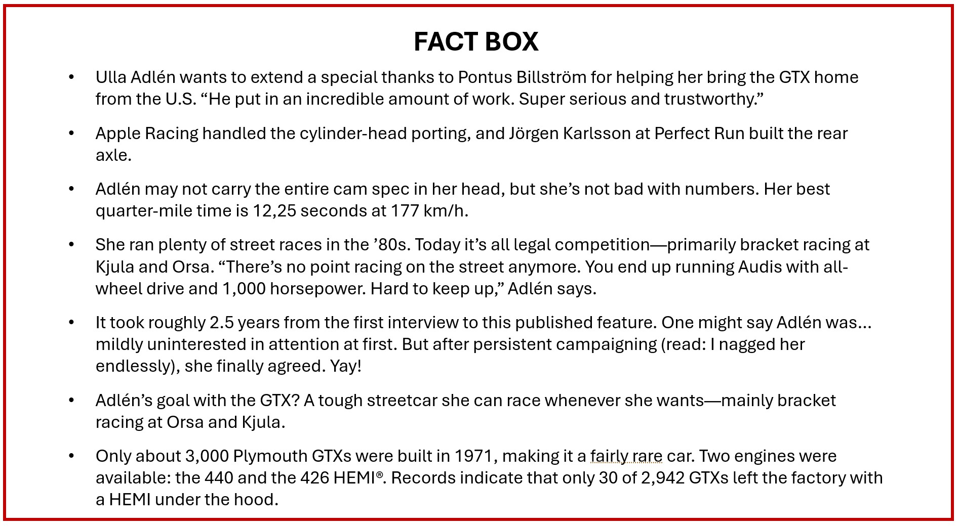 No matter how you look at it, the 1971 Plymouth GTX is one of the most striking machines of the entire muscle-car era. Fairly unique, distinctive, stately, magnificent and packed with horsepower straight from the factory – those are just a few of the GTX’s defining traits. So it’s hardly surprising that Ulla Adlén’s first choice was this model when it was time to rediscover the charm of her youthful automotive sins.