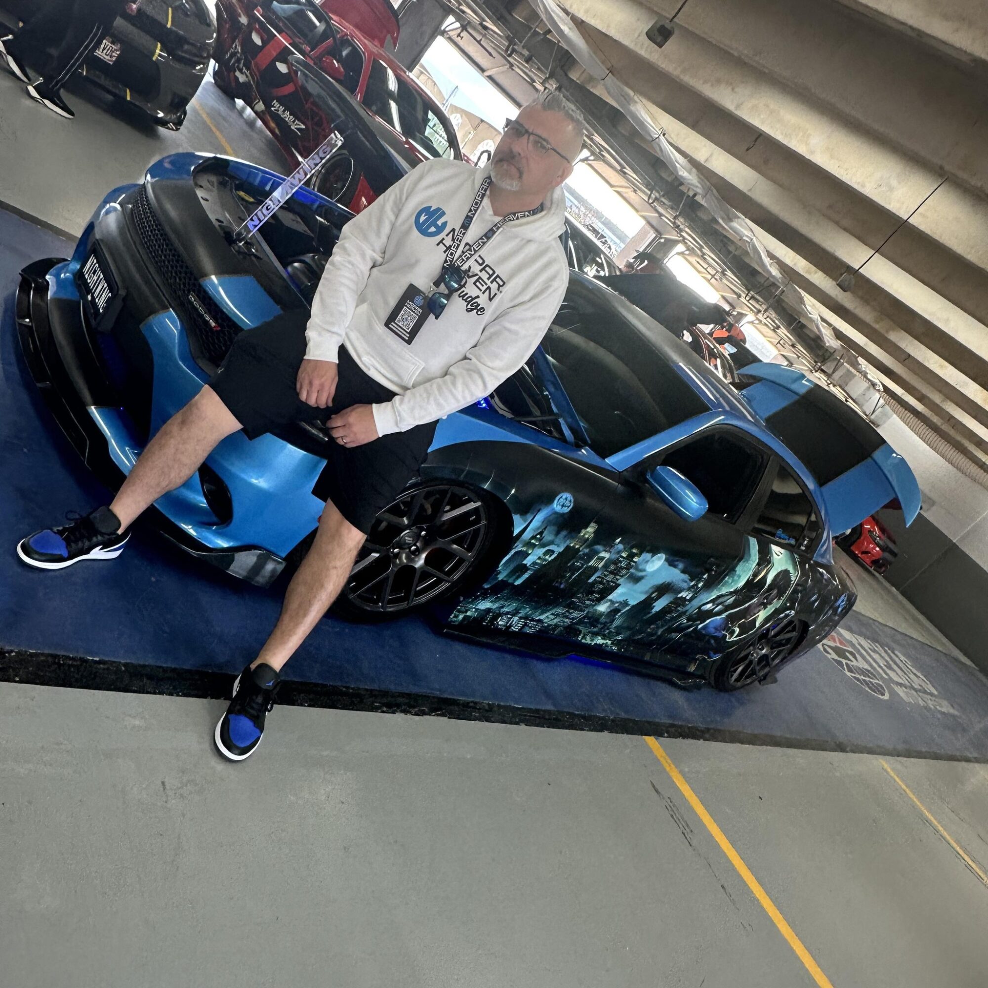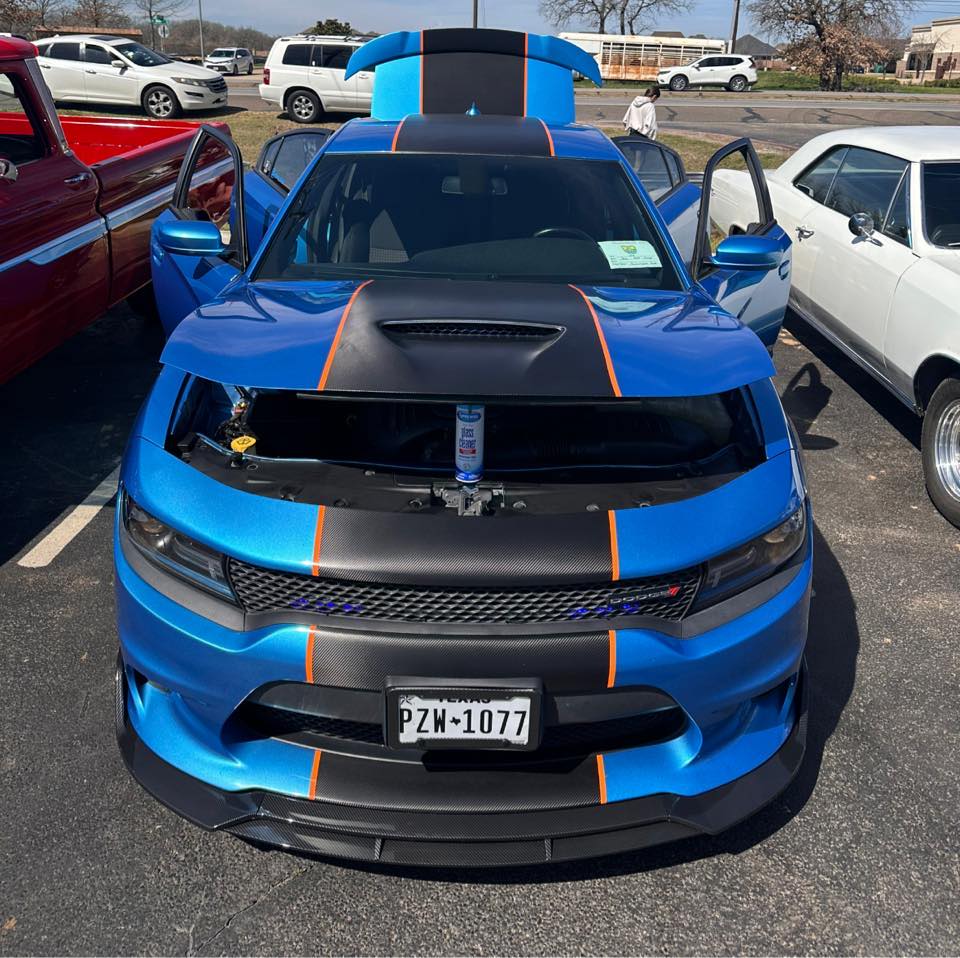 Like his earlier builds, Rusty started slow. Carbon fiber splitter and side skirts, a diffuser in the back, and under-glow within the first two months. This was his daily driver, it went everywhere, from Phoenix for his daughter’s travel basketball to the Grand Canyon, racking up miles and memories. When the factory racing stripes started peeling in late 2022, he found C and K Designs in his hometown of Aledo, and the evolution began.