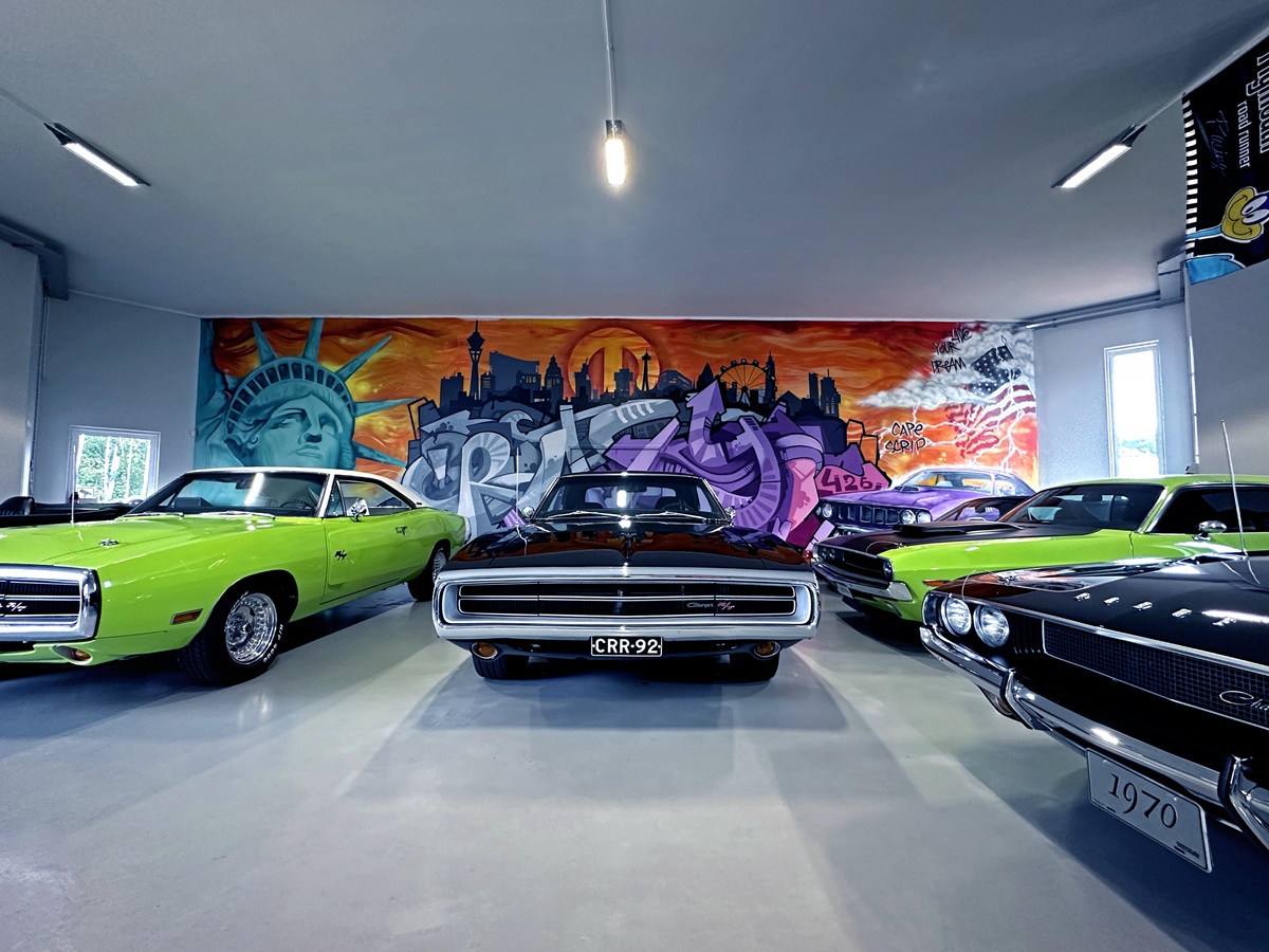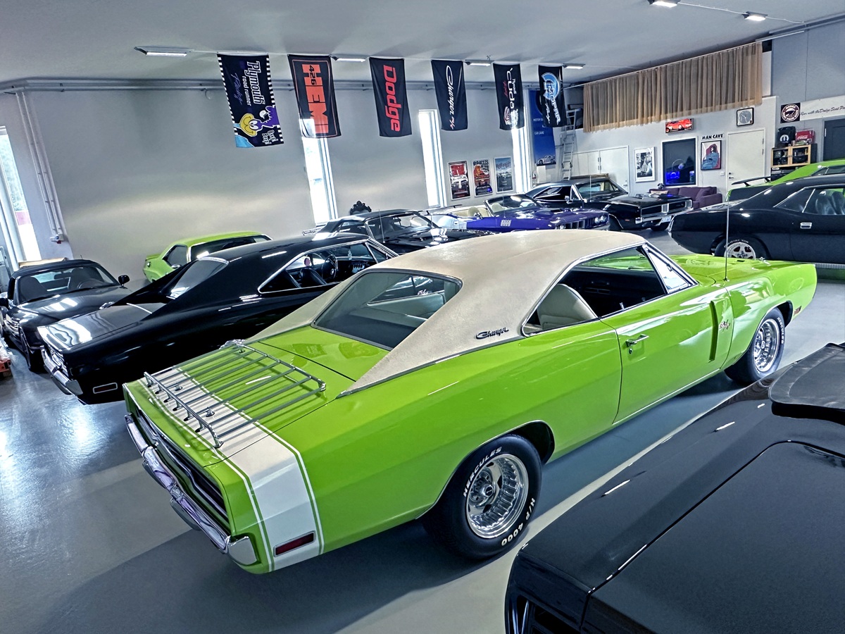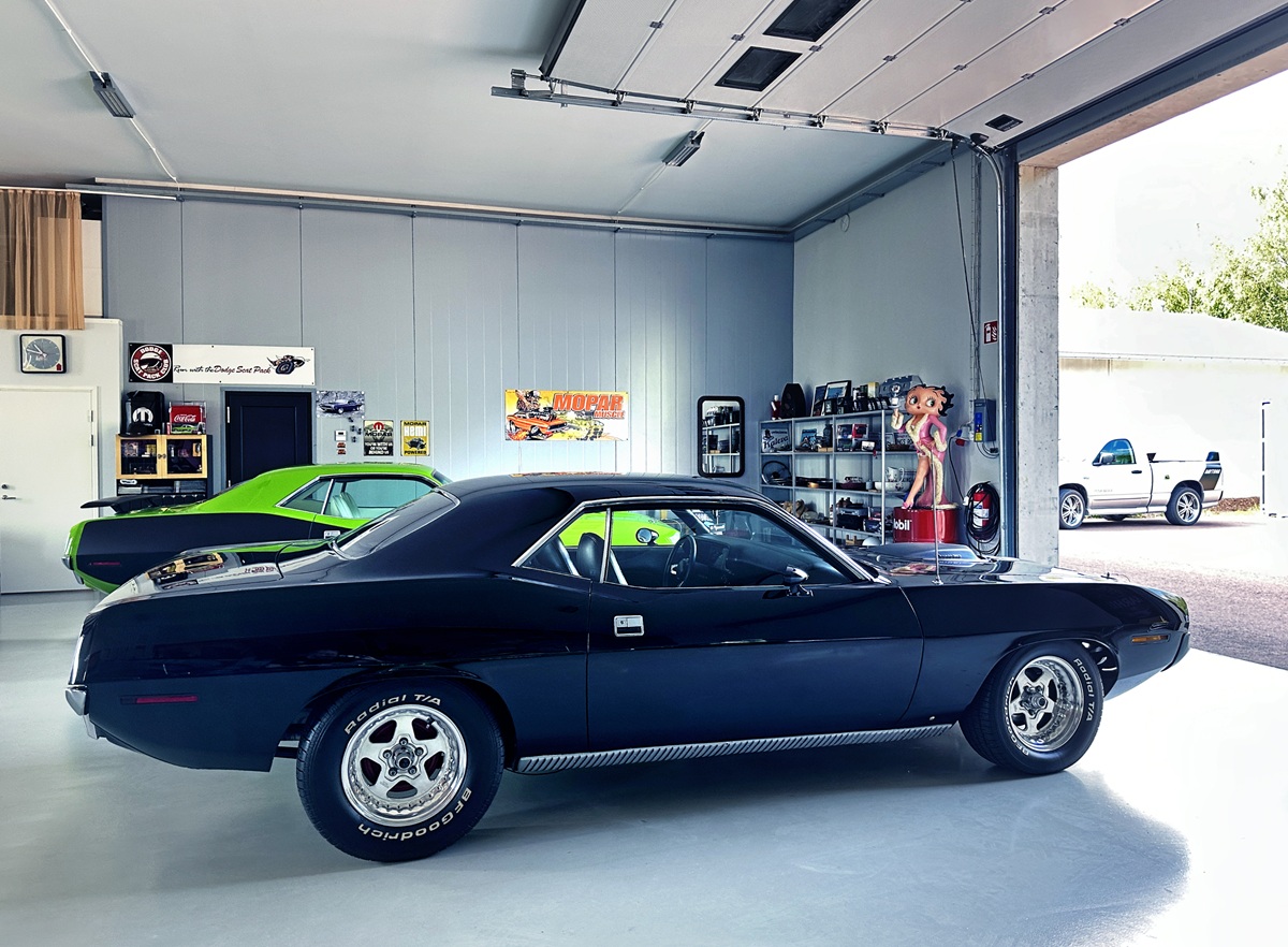 It’s Ralf who opens the doors and greets me. So let’s start with his story. He lets the sunlight spill into the clinically clean garage. Was it worth waiting for this moment? Oh yes. The cars gleam – freshly polished and glossy. The colors crowding this space come straight from Chrysler’s High Impact Paint palette launched in the summer of 1969. FJ6 Sassy Grass. FJ5 Sublime. FC7 In-Violet. All accompanied by