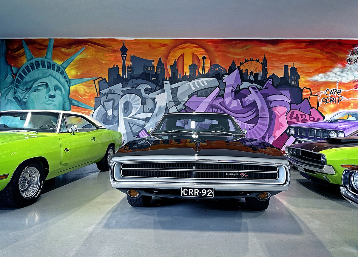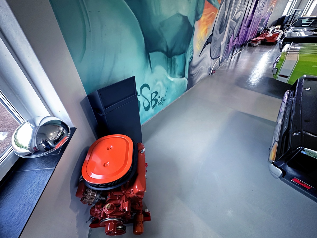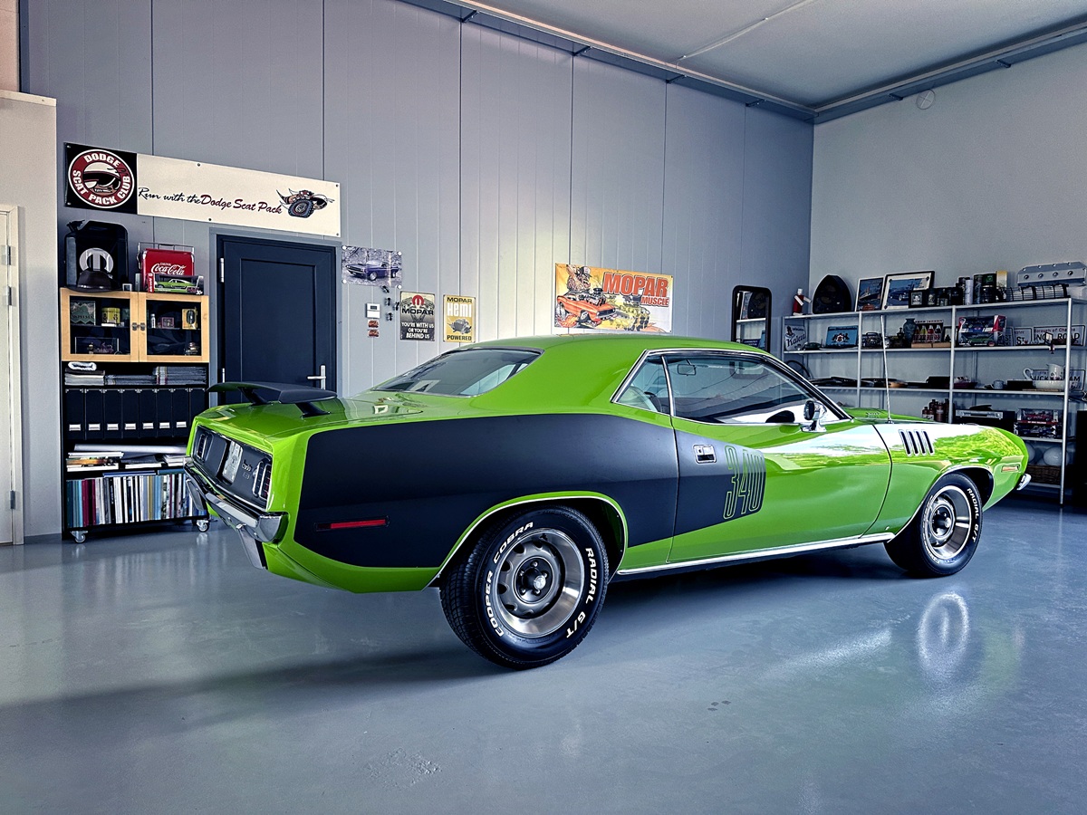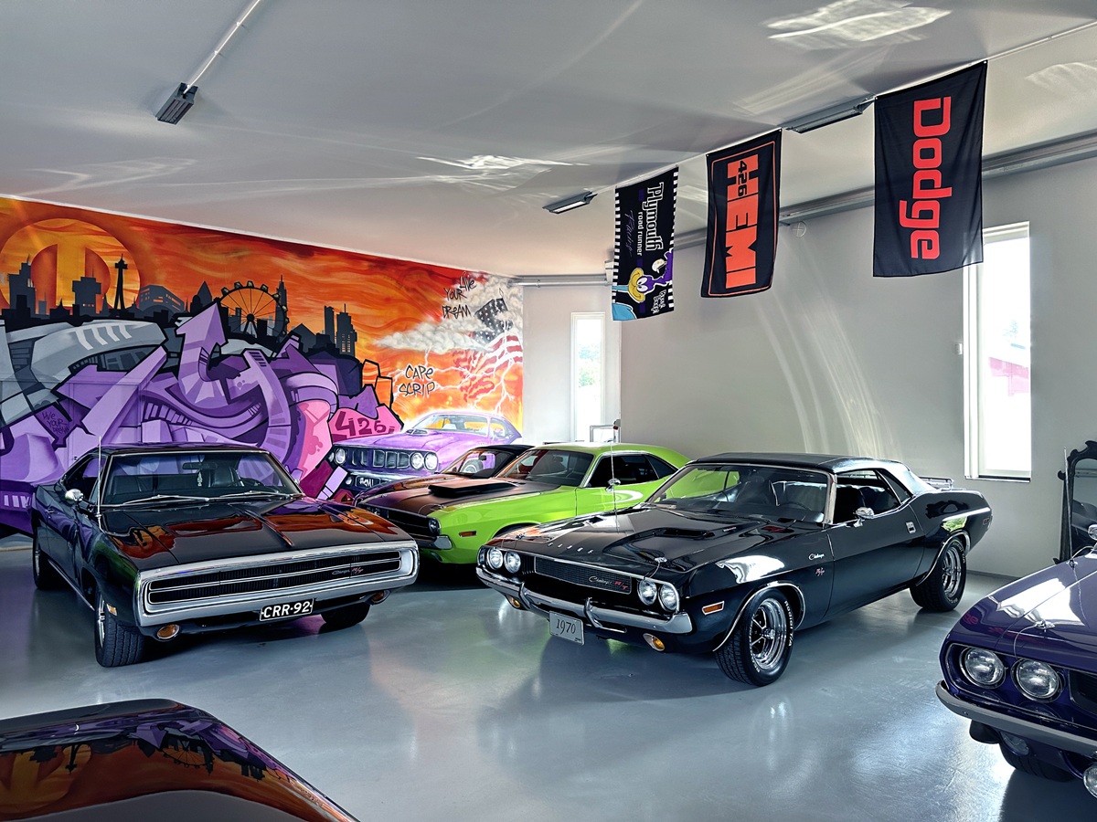 It’s Ralf who opens the doors and greets me. So let’s start with his story. He lets the sunlight spill into the clinically clean garage. Was it worth waiting for this moment? Oh yes. The cars gleam – freshly polished and glossy. The colors crowding this space come straight from Chrysler’s High Impact Paint palette launched in the summer of 1969. FJ6 Sassy Grass. FJ5 Sublime. FC7 In-Violet. All accompanied by
