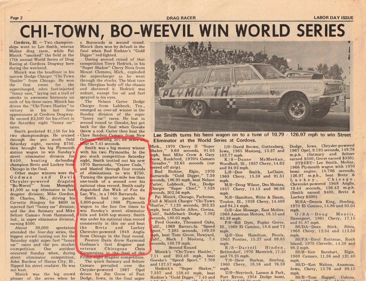 Lee was not having the results he wanted due to numerous parts issues like shattered clutches, due to the heavy flywheel needed to get the heavy car off the line, which were taking their toll on the drivetrain. Things needed to change for Lee. He was also getting razzed by fellow Mopar Super Stock racers for spending too much time and money, and not getting any results with the wagon. It was around mid to late 1969 that Lee decided to switch classes and move his wagon into NHRA’s Modified Production class. Here, the more liberal engine rules combined with a much improved flywheel/clutch set-up would allow for softer launches with some tire slippage, and this meant fewer broken parts. Soon, Lee’s wagon was winning races in the Modified Production classes.