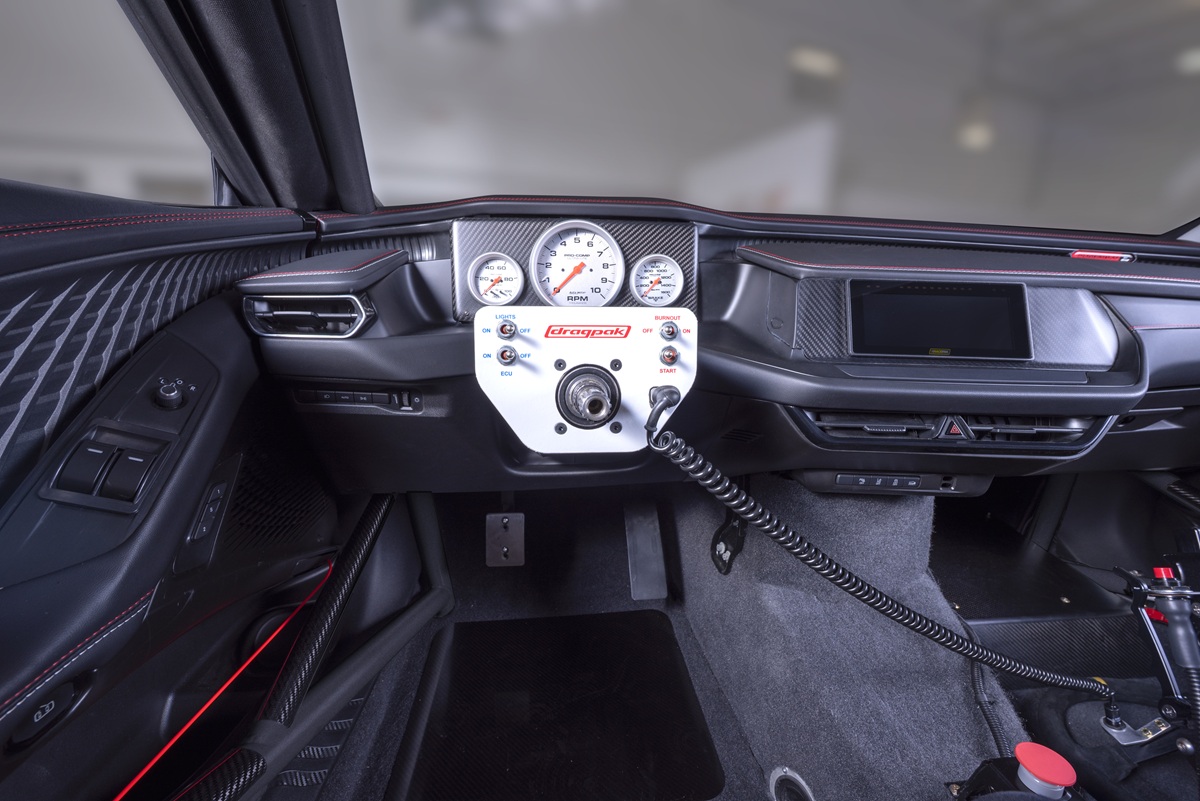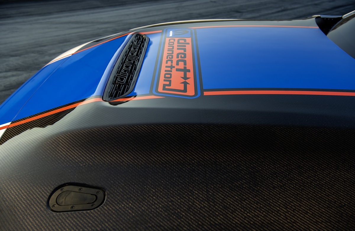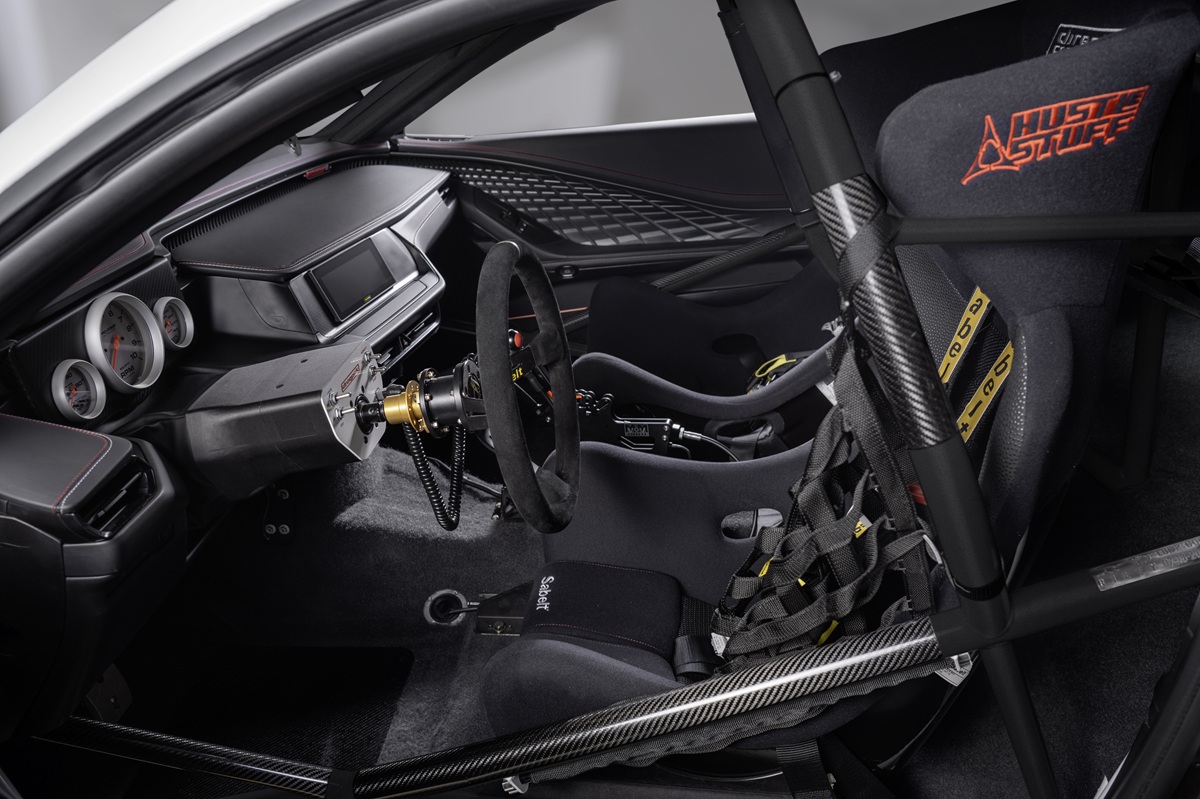 The full interior includes carbon-fiber instrument panel closeouts and an SFI 25.5/7.50 ET NHRA-certified chromoly roll cage, Sabelt lightweight SFI-certified seats embroidered with Direct Connection and Hustle Stuff logos, Sabelt SFI-certified safety harnesses and a window net.