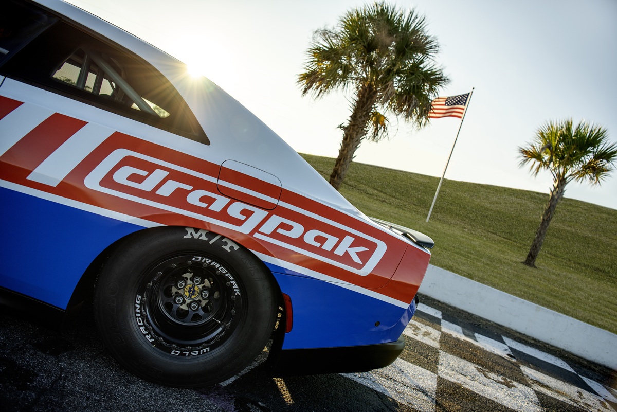 The all-new Dodge Charger Drag Pak takes a page out of the original Hustle Stuff catalogs and incorporates multiple lightweight parts in the next-generation race-ready drag car. The Charger Drag Pak brings the look and feel of the all-new Charger to NHRA drag racing for the first time ever in a package that is 100 lbs. lighter than the previous Challenger Drag Pak.