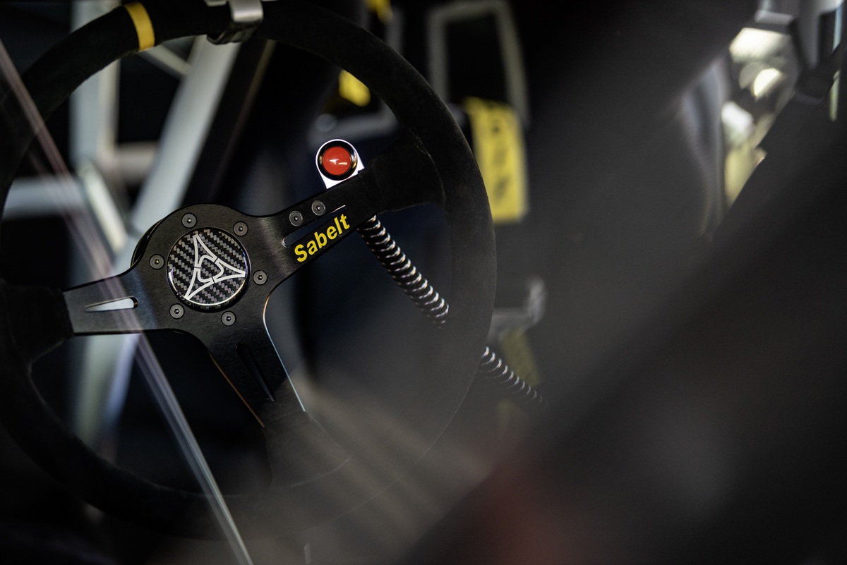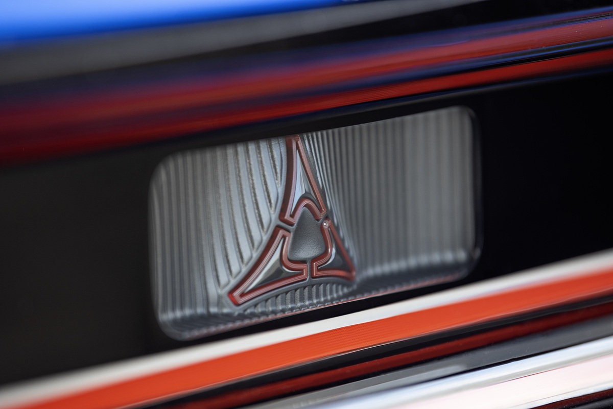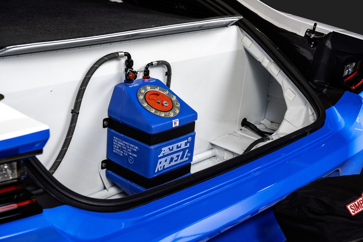 The muscular widebody race car has been further enhanced with a lightweight front suspension K member, front and rear bumpers, driveshaft loop, chromoly safety cage, 10-foot cross-form parachute and wheelie bar with wheels inspired by the iconic Fratzog logo.