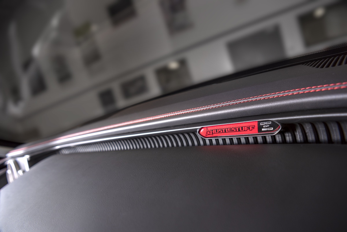 The Drag Pak’s interior maintains elements of the new production Charger’s driver-focused design and incorporates distinctive Drag Pak ID through a unique HUSTLE STUFF badge on the instrument panel. The removable steering wheel features a carbon-fiber-styled Fratzog logo in the center, offering another nod to the all-new Charger.