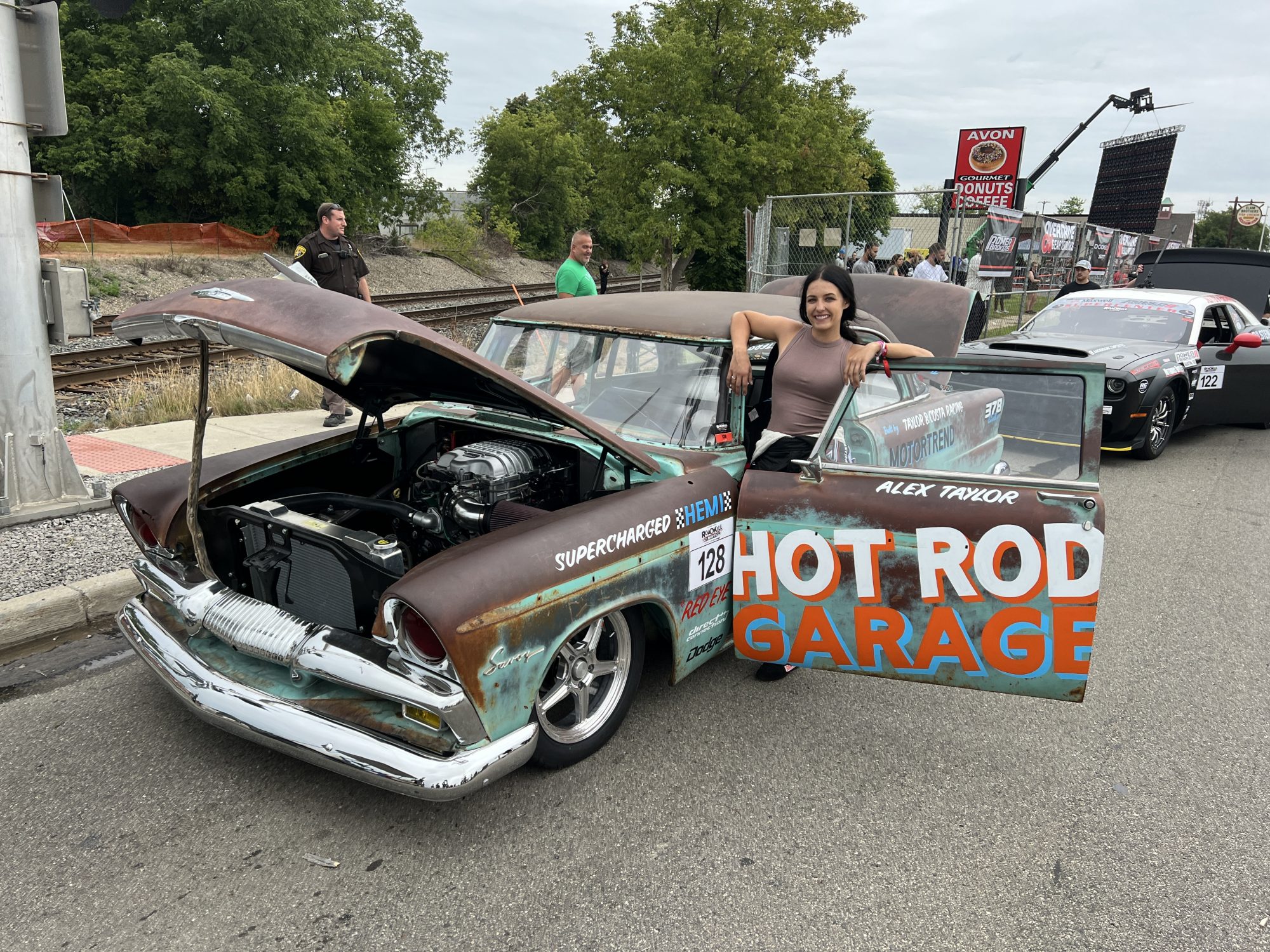 This was the first time Alex raced a car with a manual transmission and it did present some challenges. The fact she was in a high-horsepower machine and on the street and not a drag strip meant launching her 1955 Plymouth Savoy would take some finessing with the clutch and engine speed when the starters arms dropped, and it was game on. “This was my first time racing a manual transmission car and at first, it was a little intimidating and I worried about it all day because I still have that muscle memory that needs practice and I’m also weak. Getting the car set-up so I could make those shifts repetitively and consistent was something me and the team had to work through in a short time frame.” Luckily, Alex’s father, Dennis Taylor, is quite the car builder, tuner and ace wrench that knew exactly how to set the Plymouth up so it would run fast on the greasy street surface of Woodward Avenue.