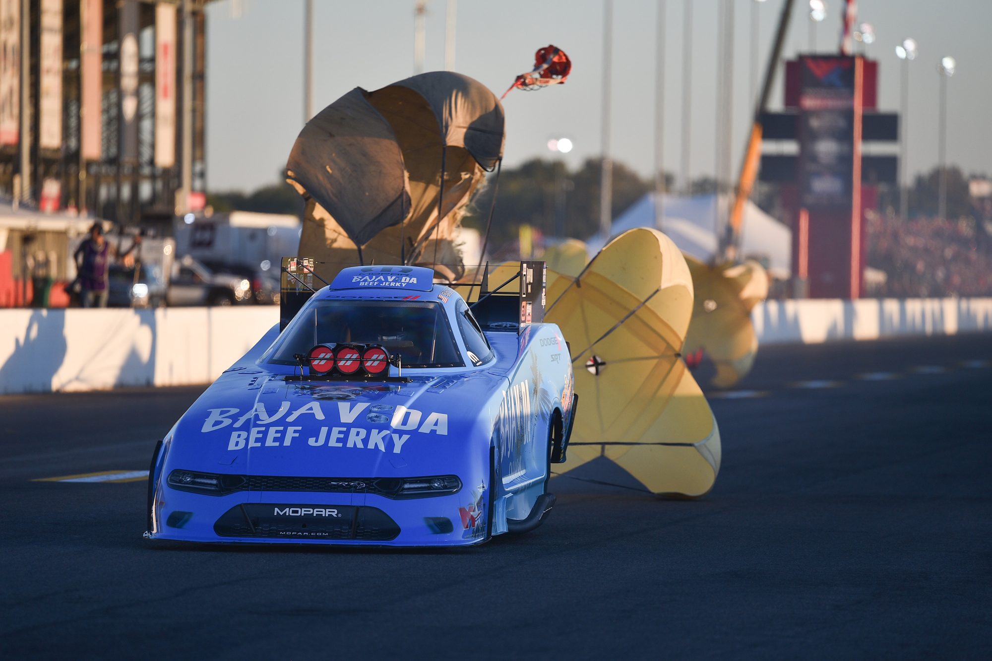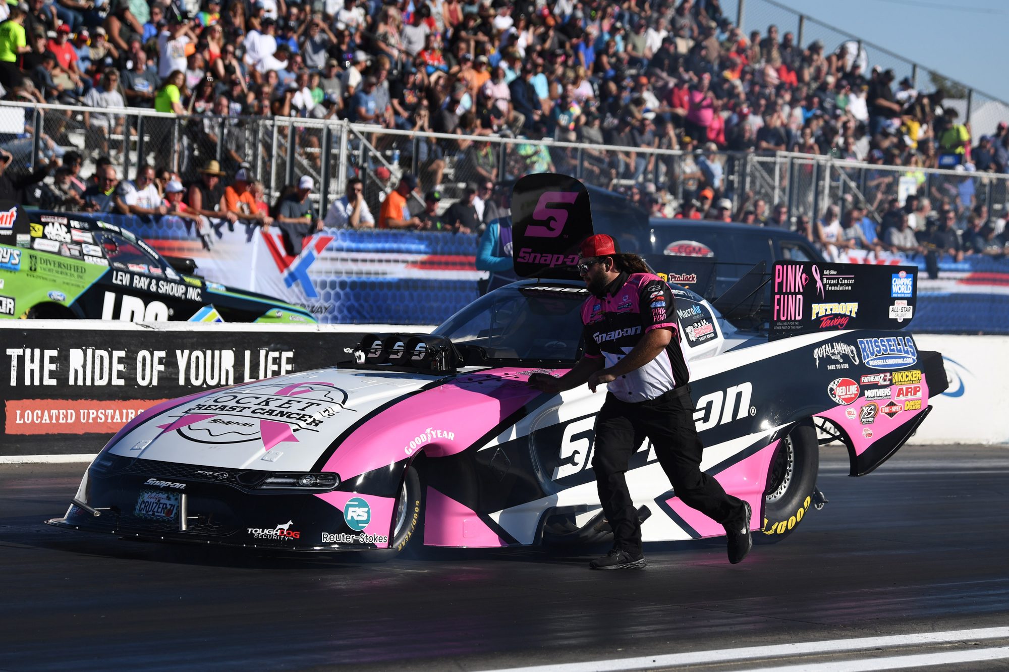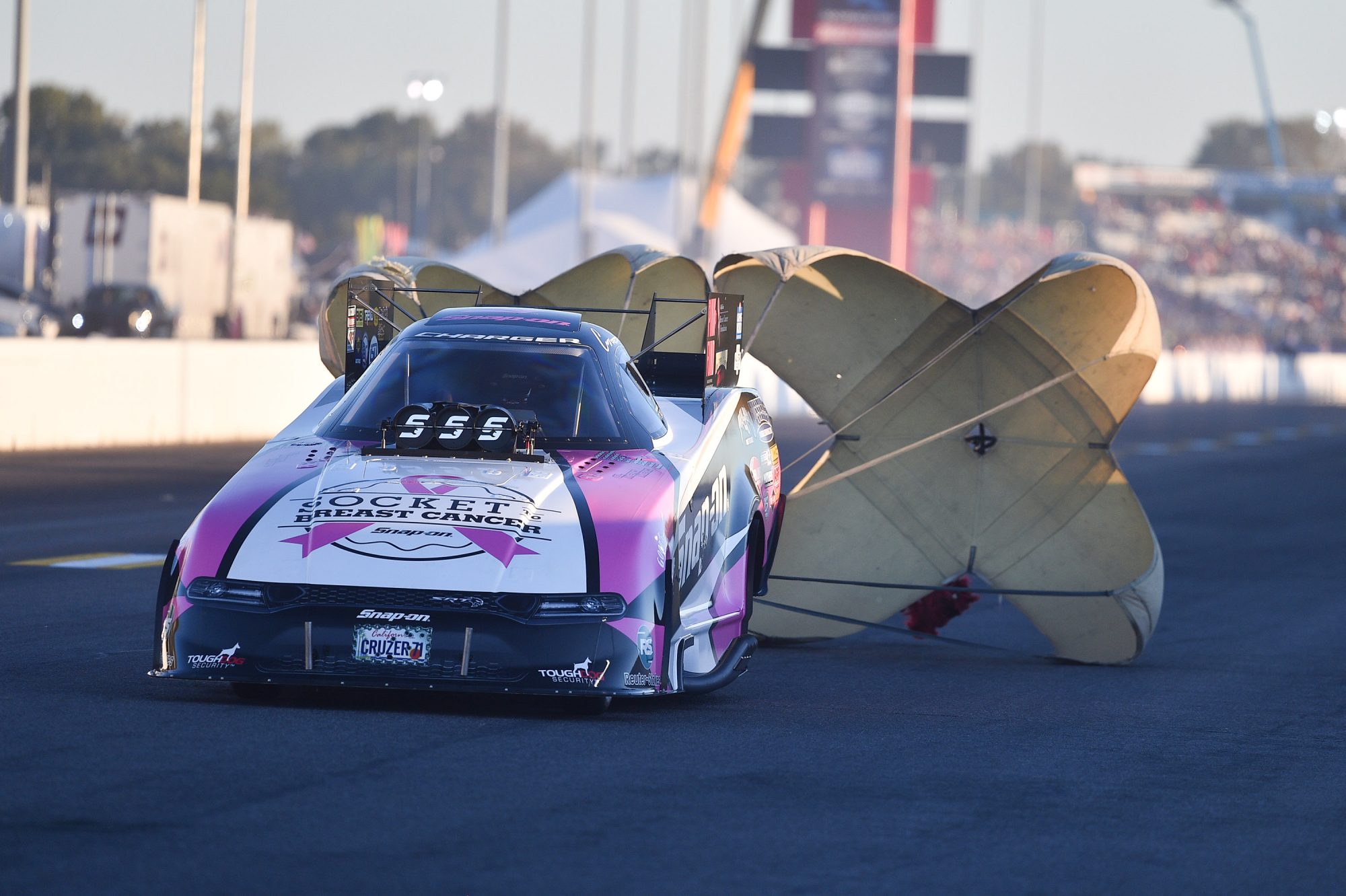 Funny Car driver Cruz Pedregon debuted a new “Socket to Breast Cancer” livery for October on his Snap-on Tools Dodge Charger SRT Hellcat in support of the Pink Fund® in the U.S. and the Kelly Shires Foundation in Canada. Pedregon’s best qualifying run of 3.897 seconds at 331.36 mph, the team’s top speed of the season, put his HEMI®-powered machine in the top half of the eliminations ladder.