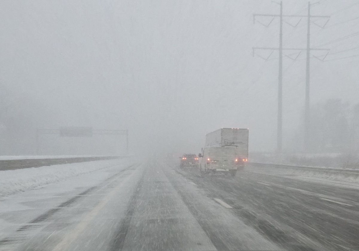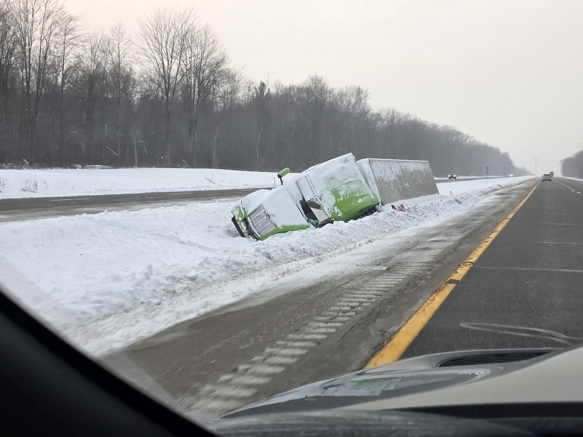 As I got closer to the storm, I could see that the roads had been cleared and salted, but there were signs of just how bad the roads had been a few hours earlier. The sides of the road were littered with vehicles that had lost control on the slick road, including a tractor trailer that had gotten off the road and rolled onto its side.