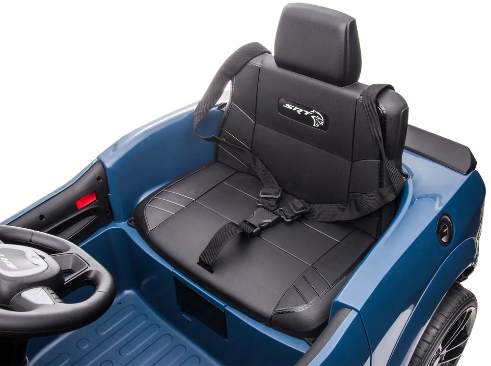 As you can see in the pictures, this is a single-seat ride-on, so it is a touch smaller than the average two-seat models, but that gives the driver more space in the SRT sport seat, complete with a three-point racing-style harness. There is also a button to make engine revving sounds, in addition to the horn button and the controls for the Bluetooth/FM radio.