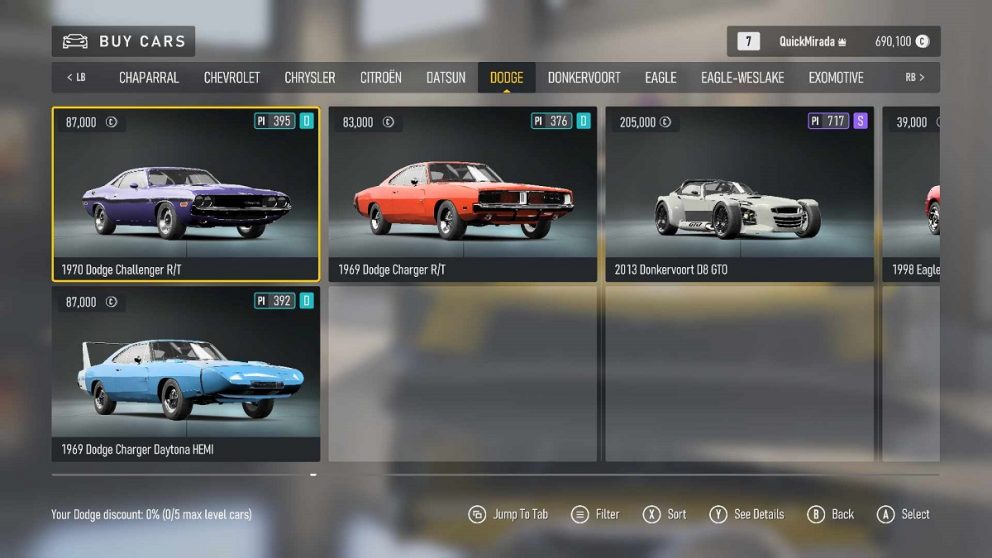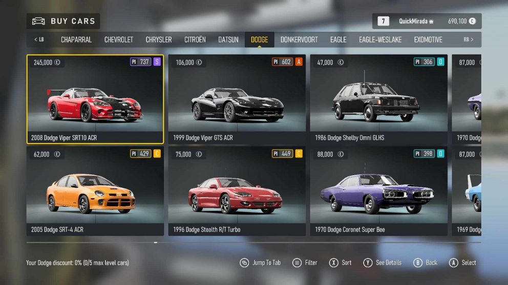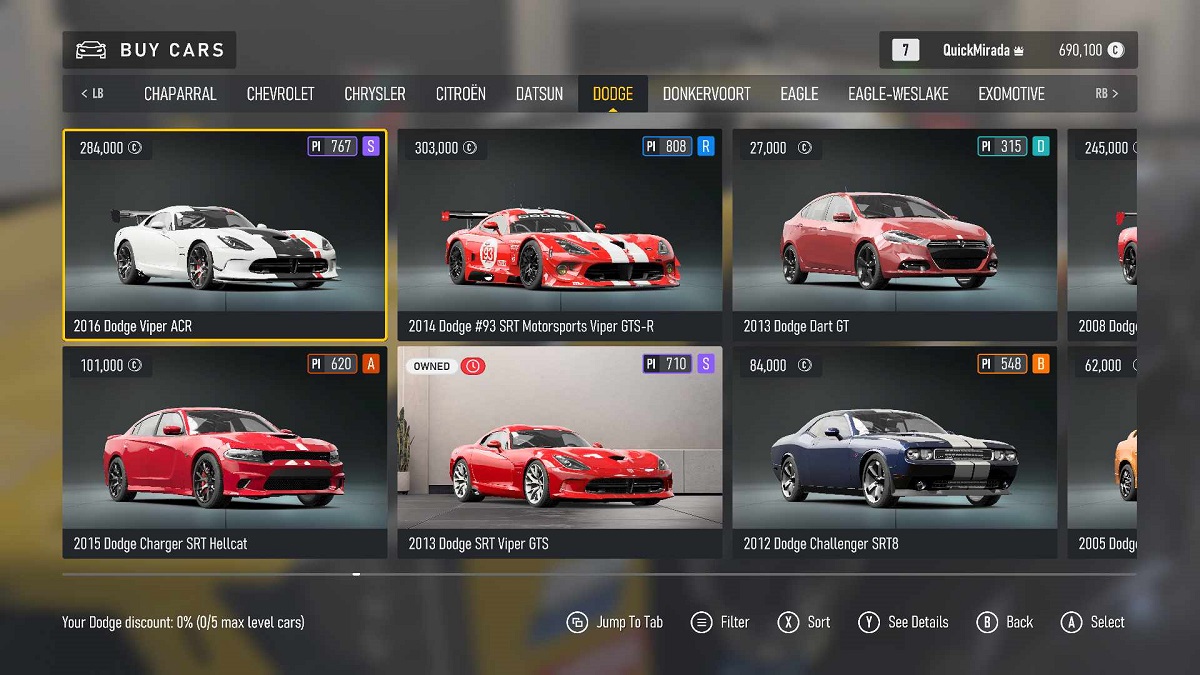 It should be noted that on the official Forza Motorsports website, they originally stated that the 2018 Dodge Challenger SRT Demon is included, but so far, it is not available for me to purchase. I am guessing that it will either be unlocked as a reward for some in-game accomplishment or it will be included in a future car pack. There have also been reports online that the 2015 Challenger SRT Hellcat is included as a reward for the “tour” program in the game, but again, I have not seen it in my time playing the game. The SRT Hellcat Challenger is a popular vehicle on Forza Motorsport 7 and Forza Horizon 5, so I would be shocked if it isn’t included at some point, but again, it could be part of a car pack down the road (if it isn’t added as a reward).