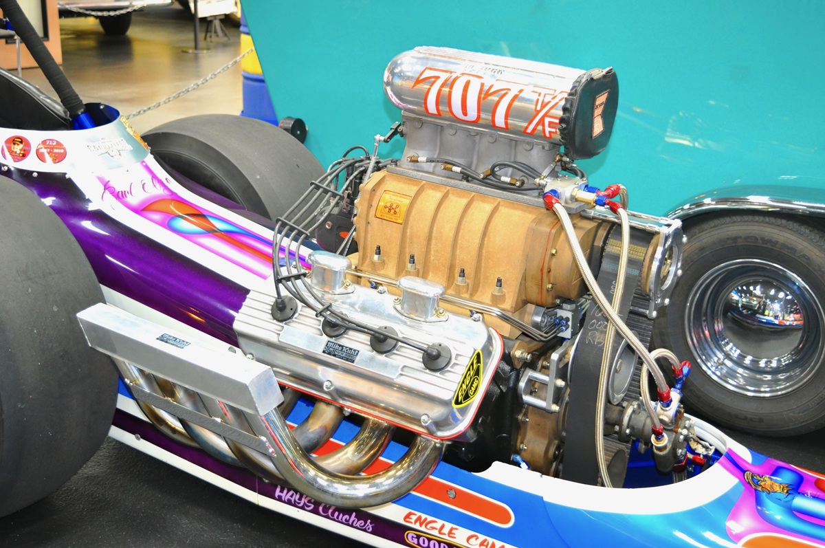 Walking the museum will reveal numerous Chrysler HEMI powerplants! This is the re-creation of the 1958 rear-engined “Bob’s Muffler” dragster equipped with the Gen I 354-cid FirePower HEMI engine topped with six Stromberg 97 carburetors, power to the ground via direct drive mated to a Halibrand Quick-change differential. Total weight? 1,210 pounds. Innovative!