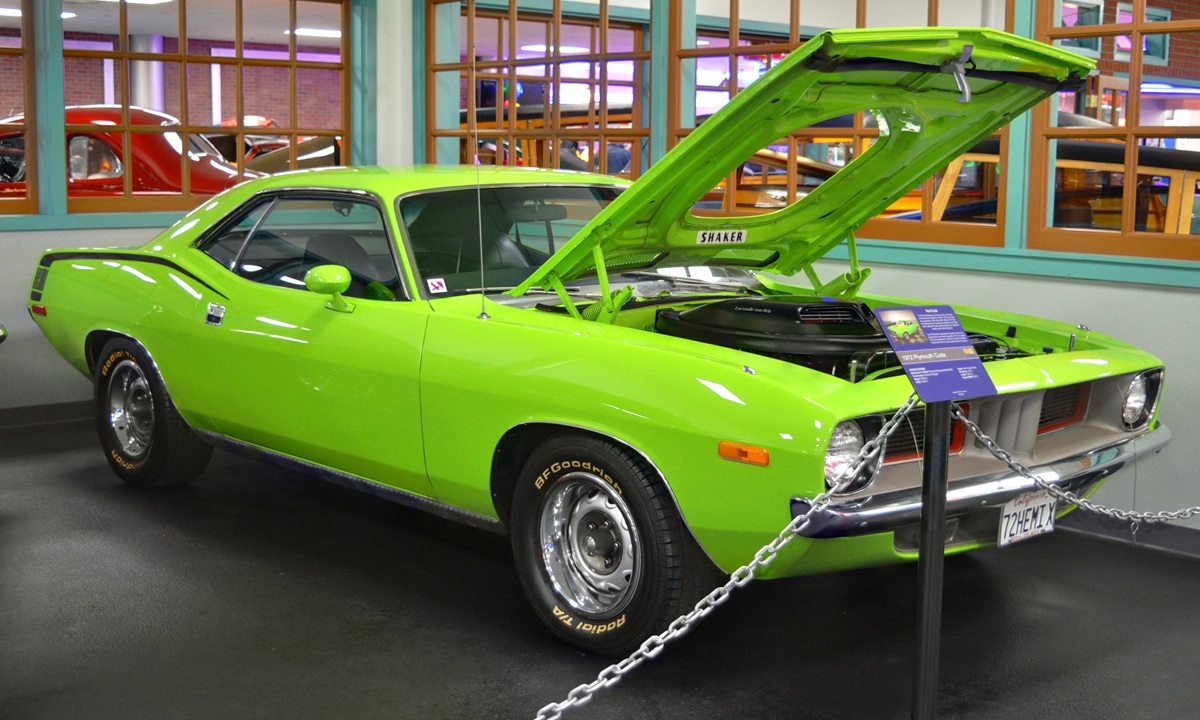 It’s a 1972 Plymouth Barracuda in Limelight Green that has been transformed into a “HEMI” car as the original 318 was removed and replaced by the upgraded 426 HEMI engine. Now a “one of none” car as by the time the 1972 models were released, the HEMI engine was gone, no longer an available factory option.