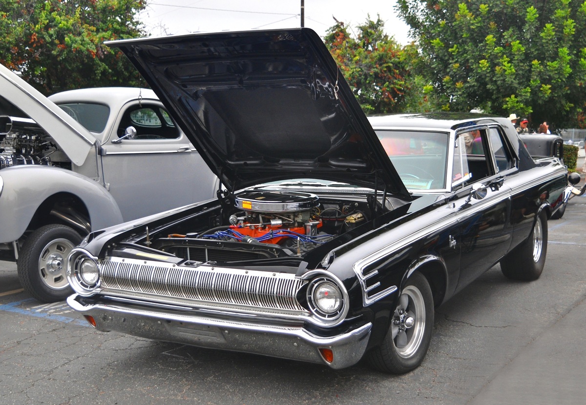 In the Lions parking lot, there was this street-racer-style 1964 Dodge 2-door “post” car, fitted with 426 HEMI engine and race version cross-ram intake. These were serious drag machines!