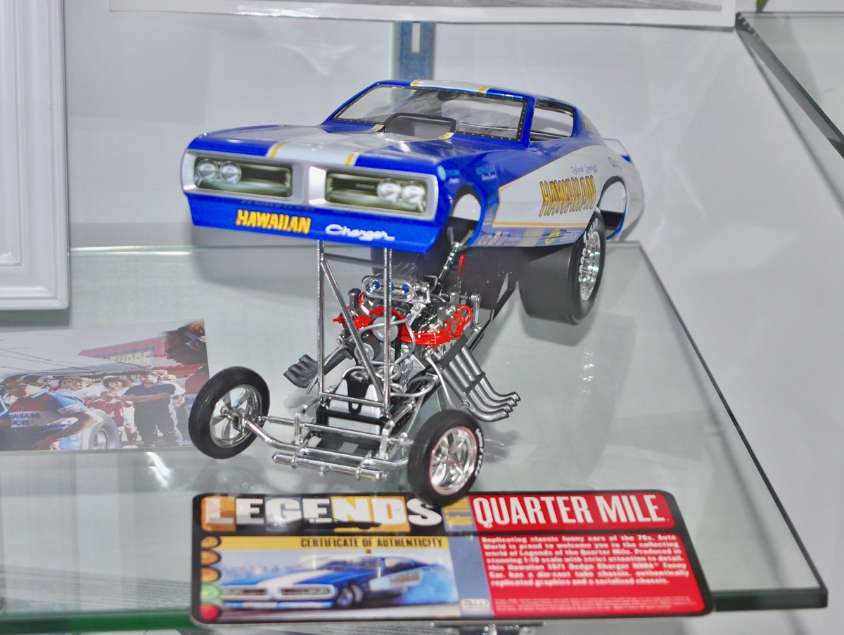 So much to see inside the display cases, a 1971 Hawaiian Dodge Charger 1:18 scale adds background to the Funny Car scene that Lions was a big part of in the wonder years of the Funny Car era.