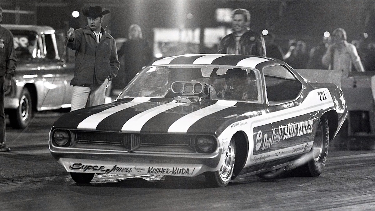 Ron O’Donnell getting ready to stage with the Don Cook “Damn Yankee” ’Cuda Funny Car, with starter Larry Sutton activating the tree!