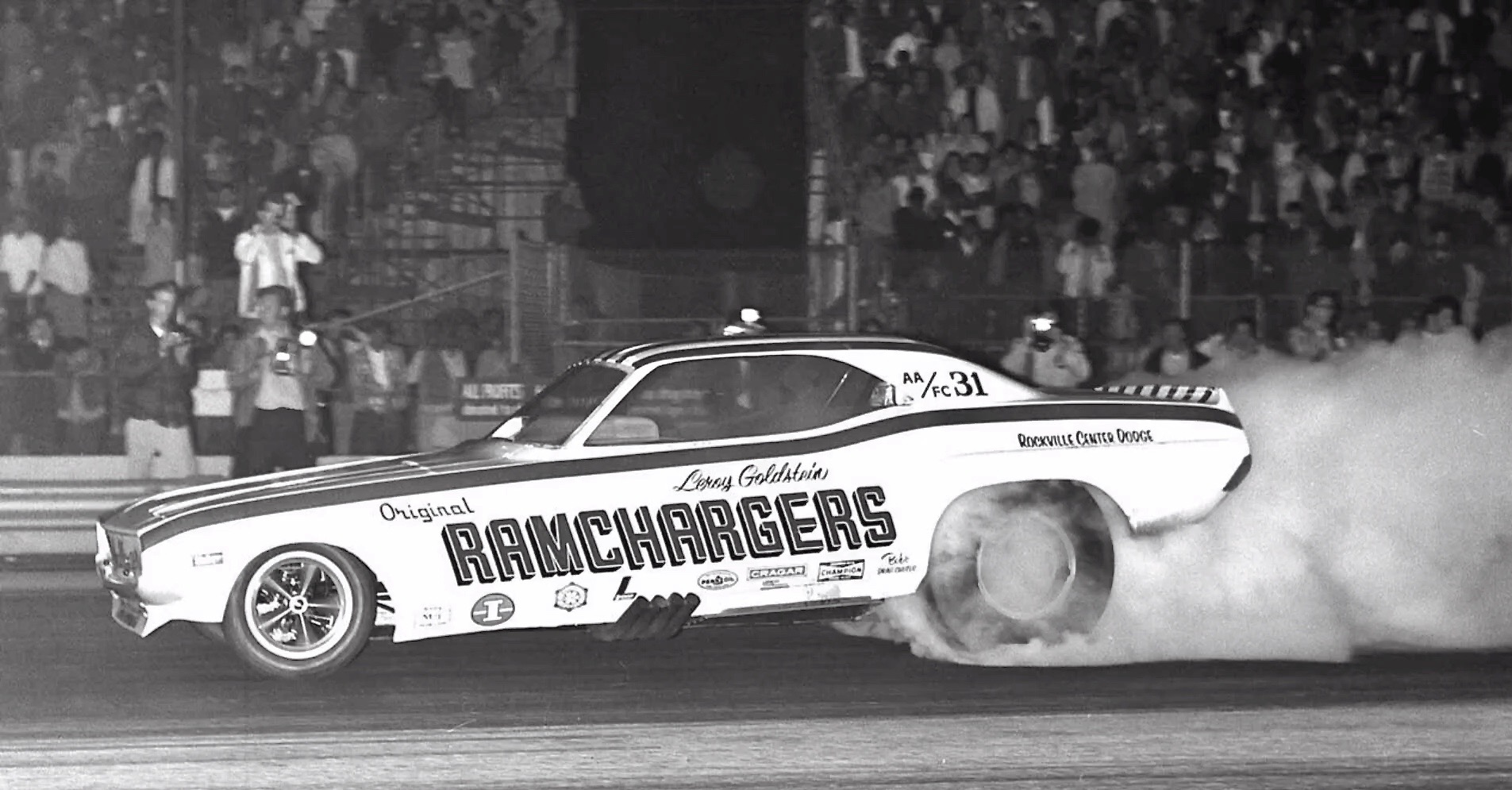 Leroy Goldstein in the RAMCHARGERS Dodge Challenger doing a smokey burnout circa 1970.
