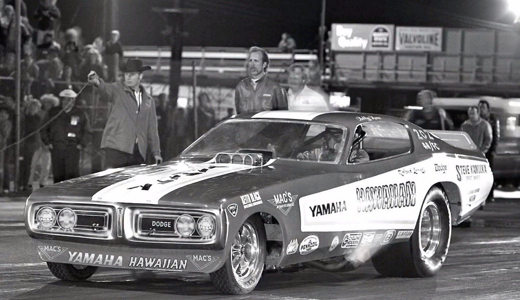The 1971 Hawaiian Dodge Charger staging up with Bobby Rowe at the controls.
