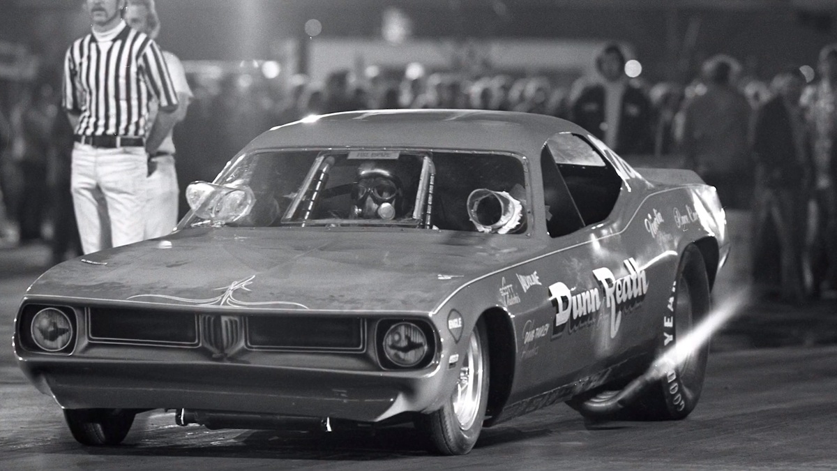 It’s a one-race only paint job, the black-hued “Snake III” ’Cuda doing its thing with a burnout.