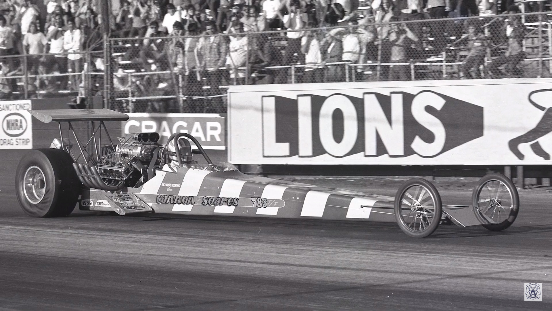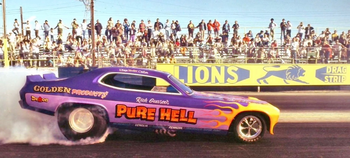 “Pure Hell” Dodge Demon nitro Funny Car doing a burnout with the Lions Drag Strip sign in the background, a smart move was the design of the track markings as a majority of all vintage images from this drag strip was somewhere in the photo the Lions name is visible.