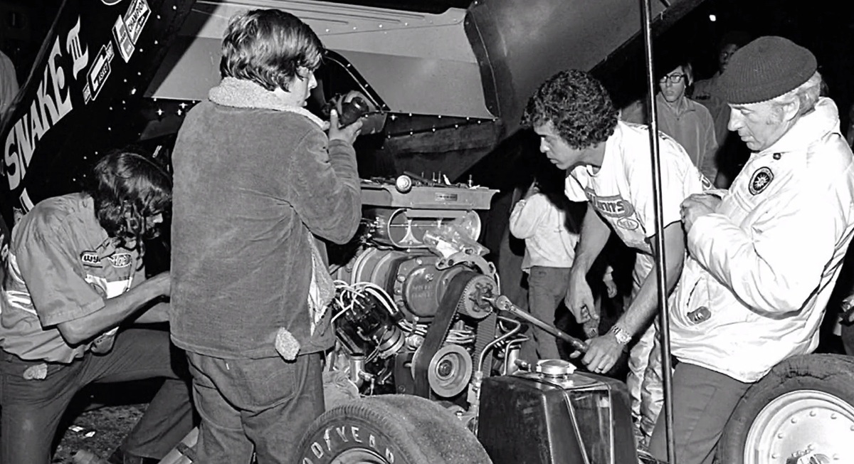 One of the cars Don Prudhomme raced at Lions was the “Snake III” black Barracuda and here’s a shot of him cranking on the supercharger with Ed Pink (far right) watching the details.