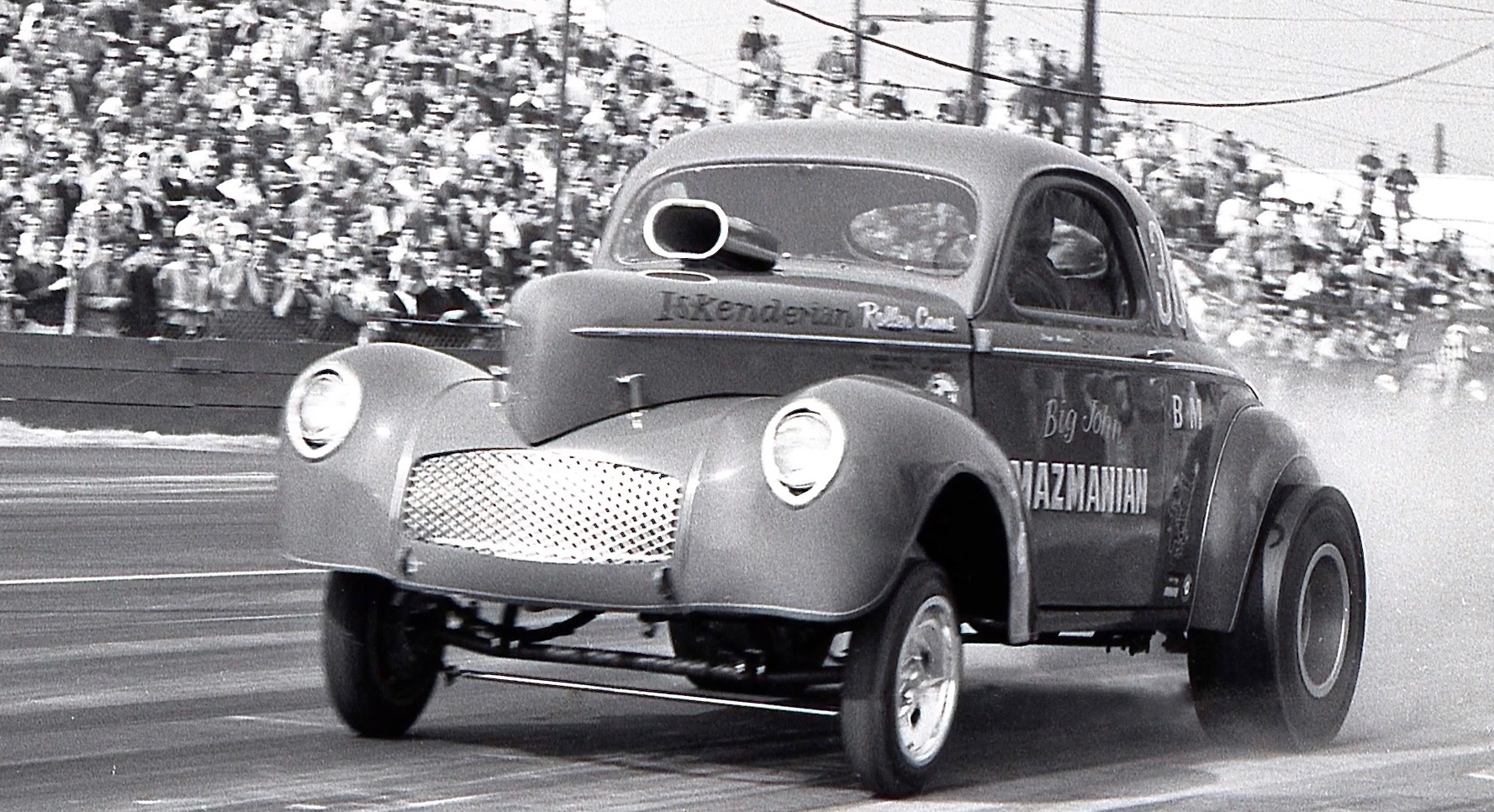 “Big John” Mazmanian and his cars were a regular sight at Lions. Here’s “Bones” in the Willys doin’ its thing albeit with some tire smoke.