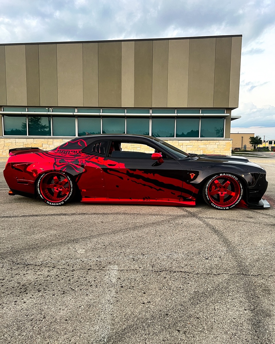 The result is a car that defies easy comparison. The stance is wide, planted, menacing. The dual chrome wrap – chrome black and chrome red – catches light in ways that demand attention. It’s a build that feels like it belongs on the SEMA floor, yet somehow still gets driven hard on Texas highways.