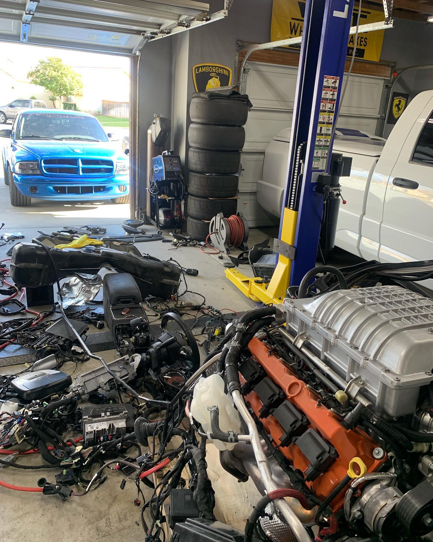 He found a 2019 Charger SRT Hellcat that had been wrapped around a tree at a salvage yard and convinced them to pull everything without cutting wires. He laid the entire car’s drivetrain and wiring harness out on his garage floor like a massive puzzle, then filmed a 30-second video for Holley Performance: “I know you guys get these messages all the time, but you’ve got a kit to put that engine in this Dakota. Let’s work together.”