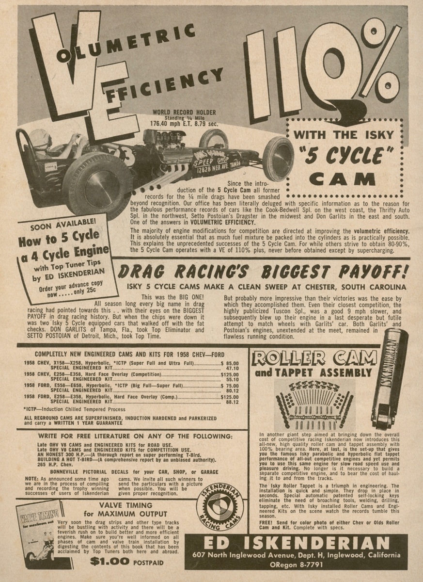 It was all about “volumetric efficiency” (something Ed learned from Ed Winfield) in this ad that came out in April 1958, the 5-Cycle camshaft and all the races it won! Roller cams were highlighted too, and the 8.79-second run at 176.40 mph run from the “Don’s Garage” dragster of Don Garlits was a new world record. Isky was on a roll!