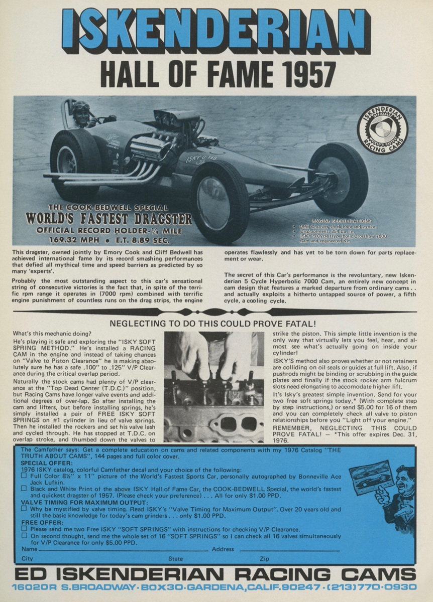 It was in 1976 (way before the nostalgia drag race dragster scene came about) that Isky’s ad agency put out this Cook and Bedwell 1957 “Isky-U’Fab” dragster “flashback” full-page ad. Emery Cook said to Isky one day, “Why don’t you make a five-cycle cam like the Italians do.” Ed thought about it, and realized it would be a fantastic publicity generator. “How could I justify a fifth cycle? Oh, it’d have to be the overlap period.” Gimmick or not, all of a sudden the Cook and Bedwell car went some 11 mph over the speed record.