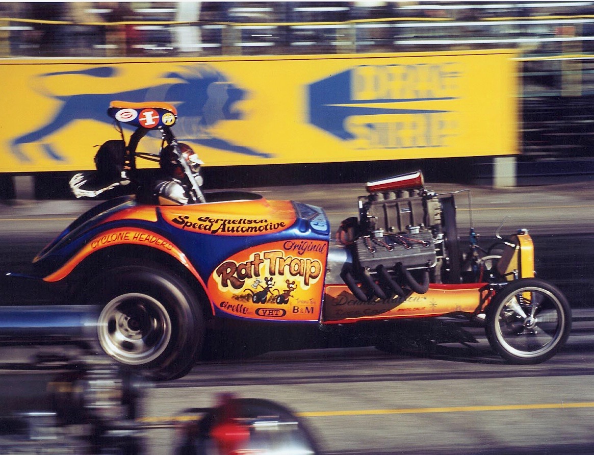 With an early Chrysler HEMI engine for power, Isky-equipped, the “Original Rat Trap” was a top-running AA/Fuel Altered back in the day, seen here making a run at Lions Dragstrip.