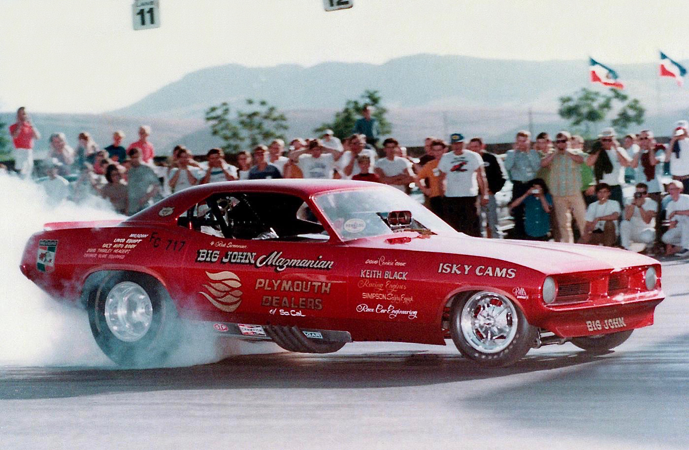 With Rich Siroonian behind the wheel in 1970, a brand-new “Big John Mazmanian” modernized ’Cuda Funny Car was built, camshaft by Isky, chassis by Woody Gilmore and with support from Chrysler Corporation in the way of Plymouth dealers of Southern California. The car was fast and eventually would become the first Funny Car to run over 220 mph (221.78 mph). With Ed Iskenderian often attending these races, the Mazmanian team was known as “The Armenian Army!”