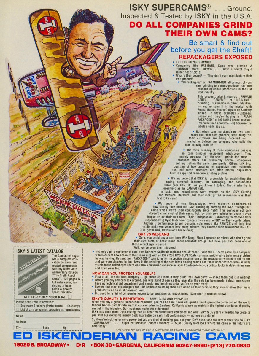 Ed and Pete Millar had loads of fun in the Isky advertising – case in point, this 1984 full-page ad that exposed “cam merchandisers” that really didn’t grind their camshafts but rather just repackaged generic cams without any technical expertise or testing capabilities. Pete did his heavily detailed cartoon artwork and in this ad, Ed picked the name “Wiz-Bang Cam Co. Ltd.” as he had remembered an old movie with Clark Gable that mentioned a real oil boom town in Oklahoma, named Wizbang, and he thought it would be perfect to describe the bogus repackaging company in the ad.